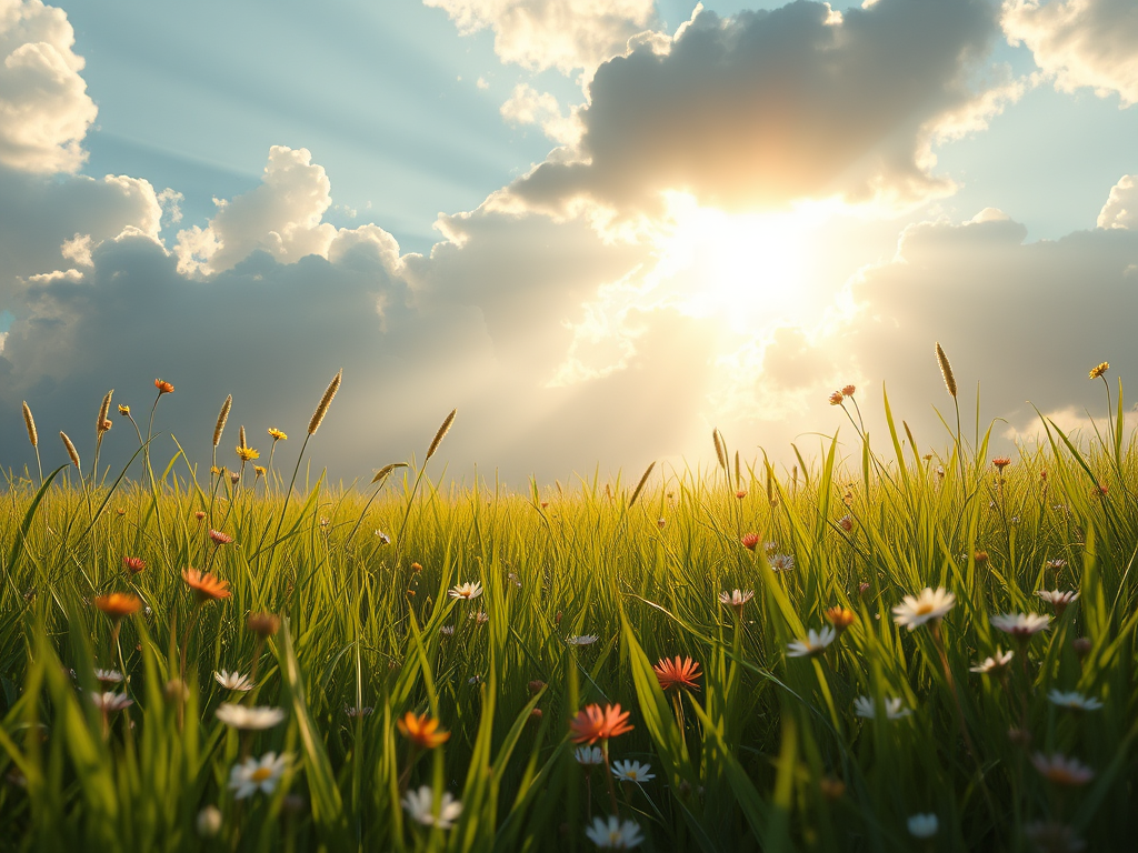 A vibrant field of green grass and colorful wildflowers under a bright sky, with rays of sunlight breaking through the clouds.