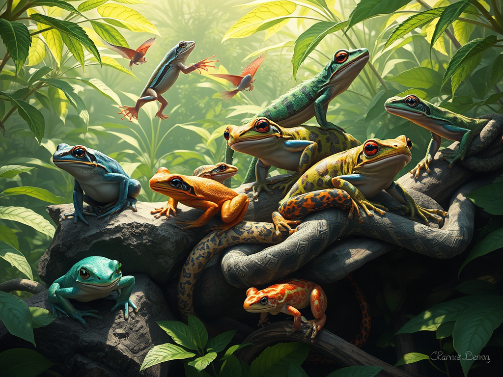 A vibrant gathering of colorful frogs amidst lush greenery, showcasing the diversity of amphibian life in a tropical habitat.