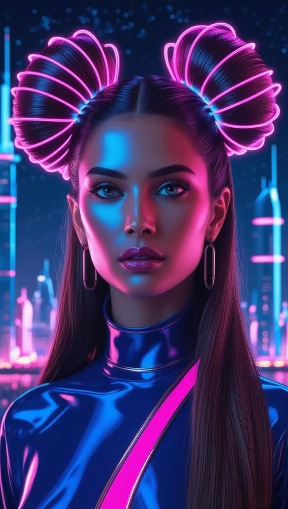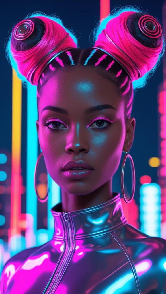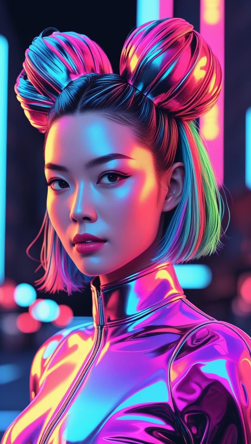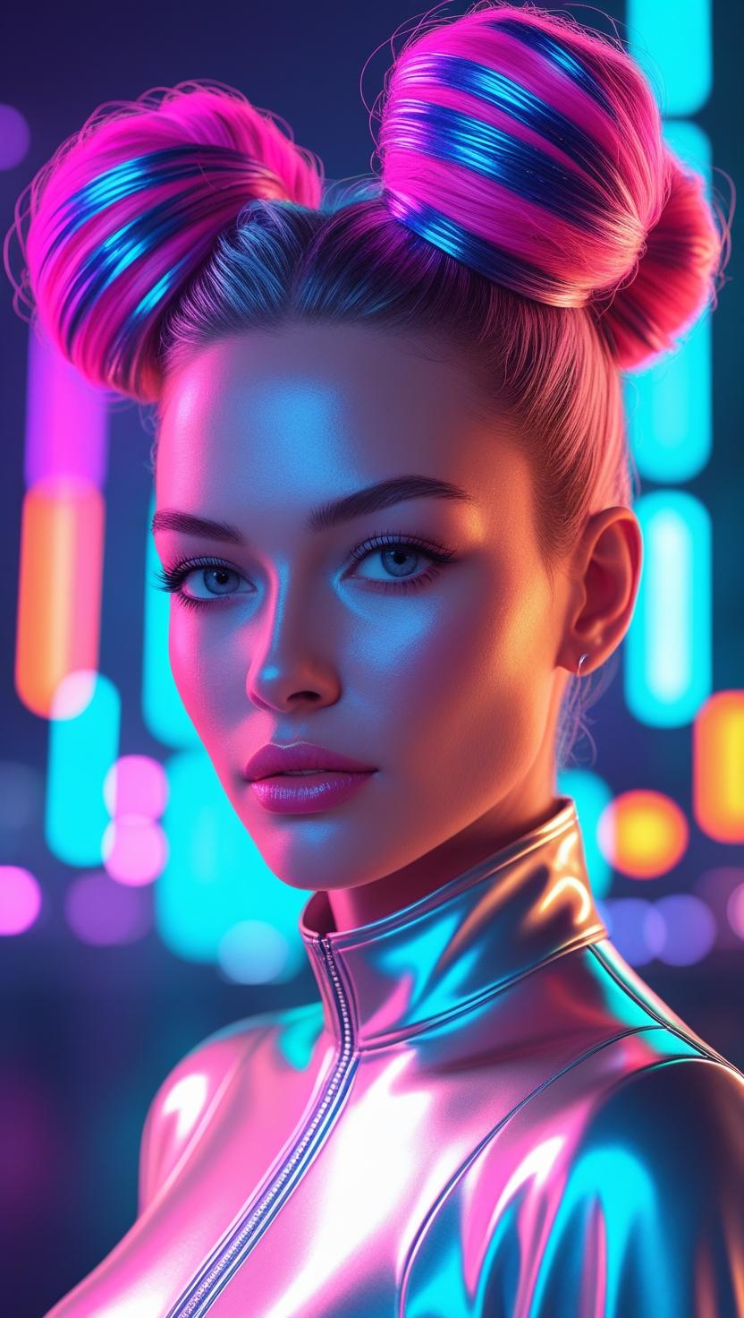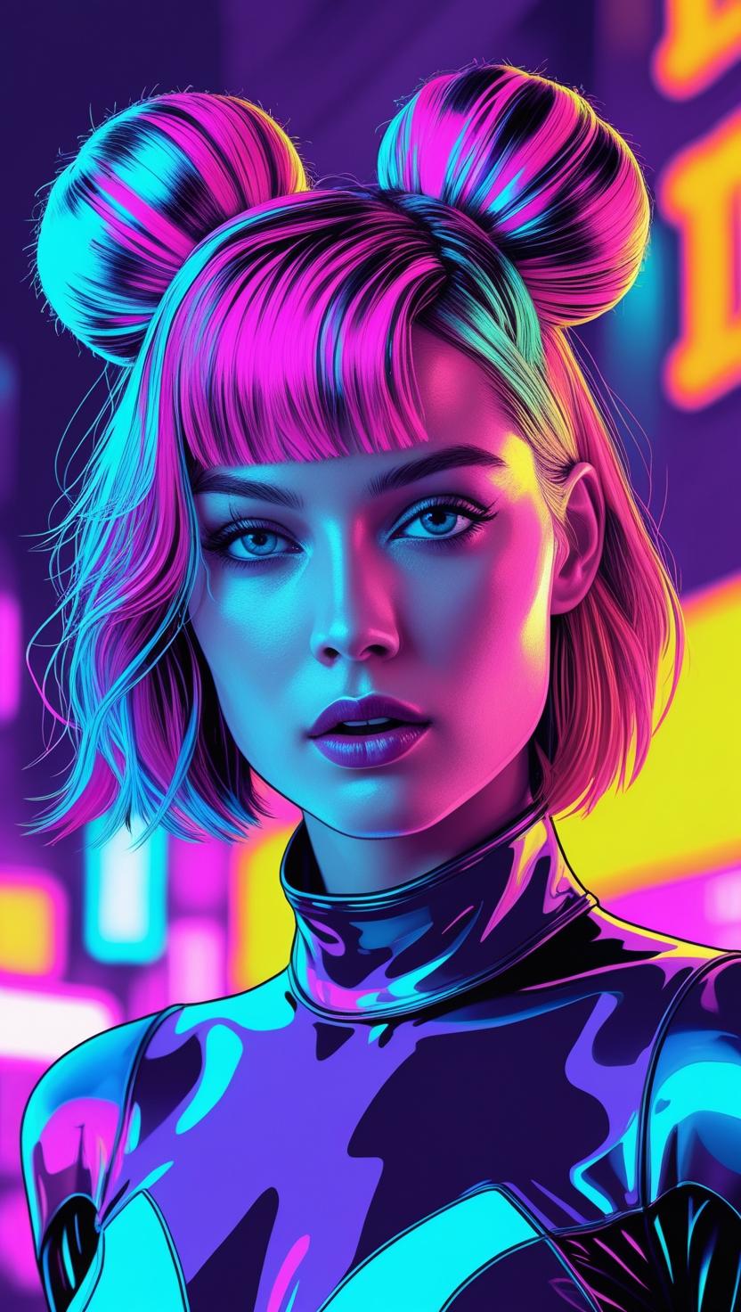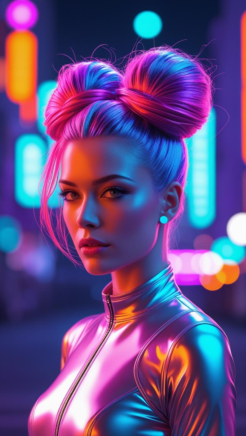 A futuristic woman with vibrant, metallic space buns and neon streaks, against a backdrop of glowing city lights.short hair
