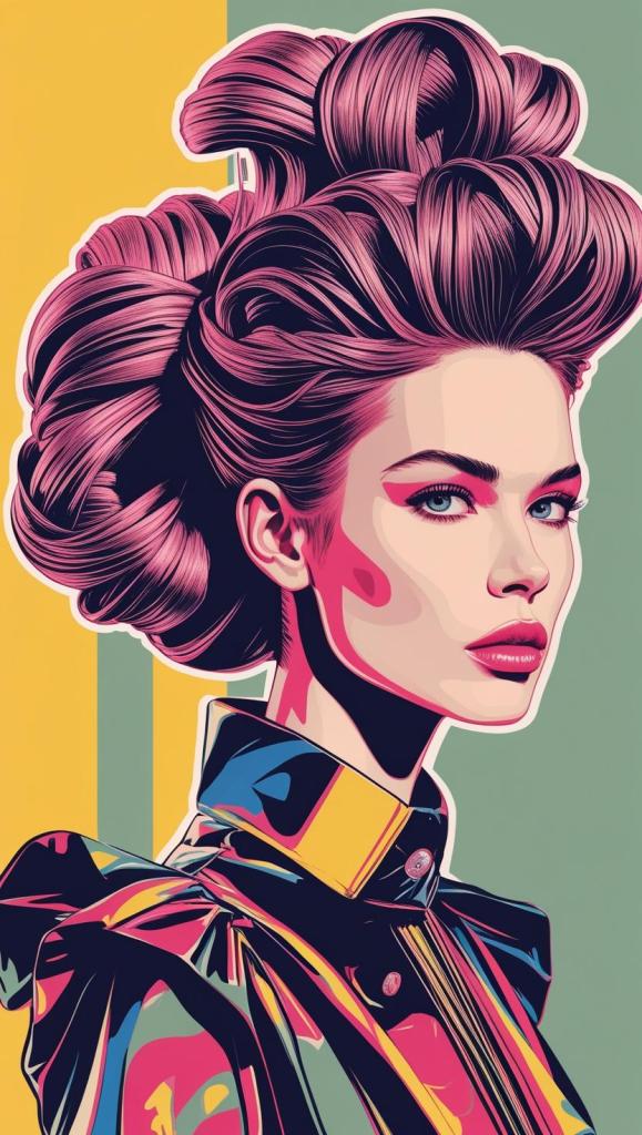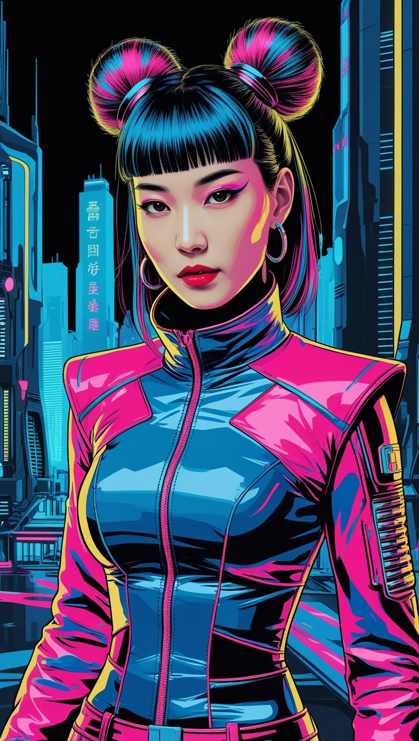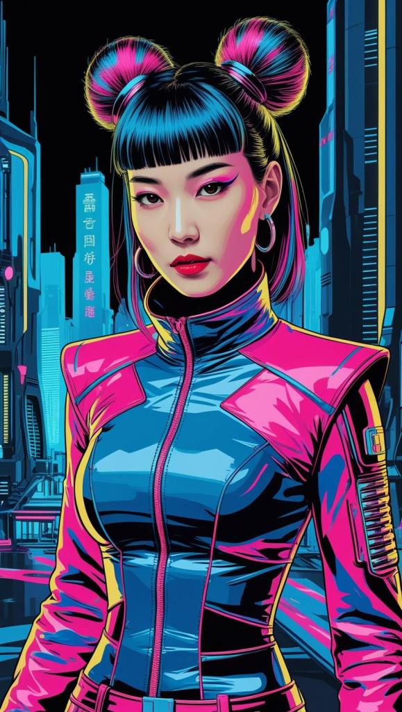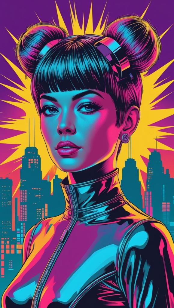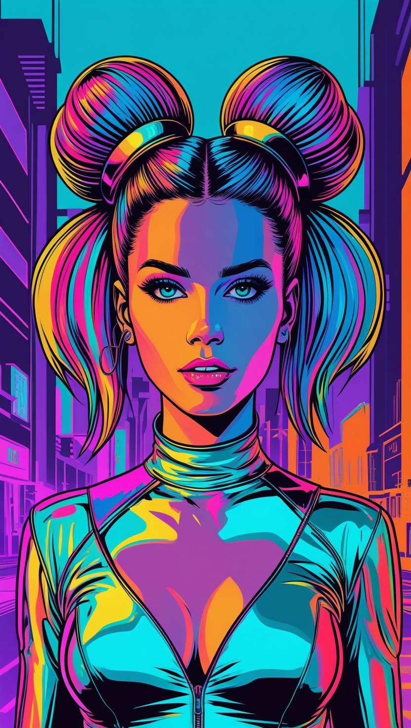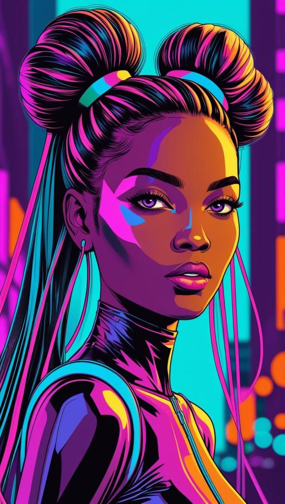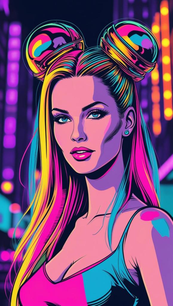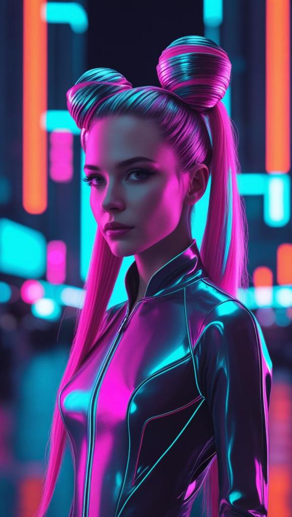 A futuristic woman with vibrant, metallic space buns and neon streaks, against a backdrop of glowing city lights.short hair