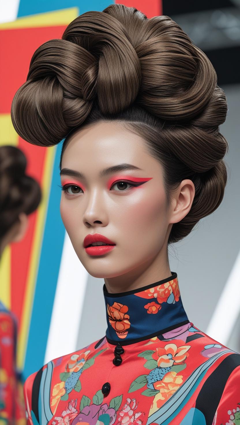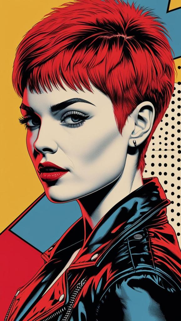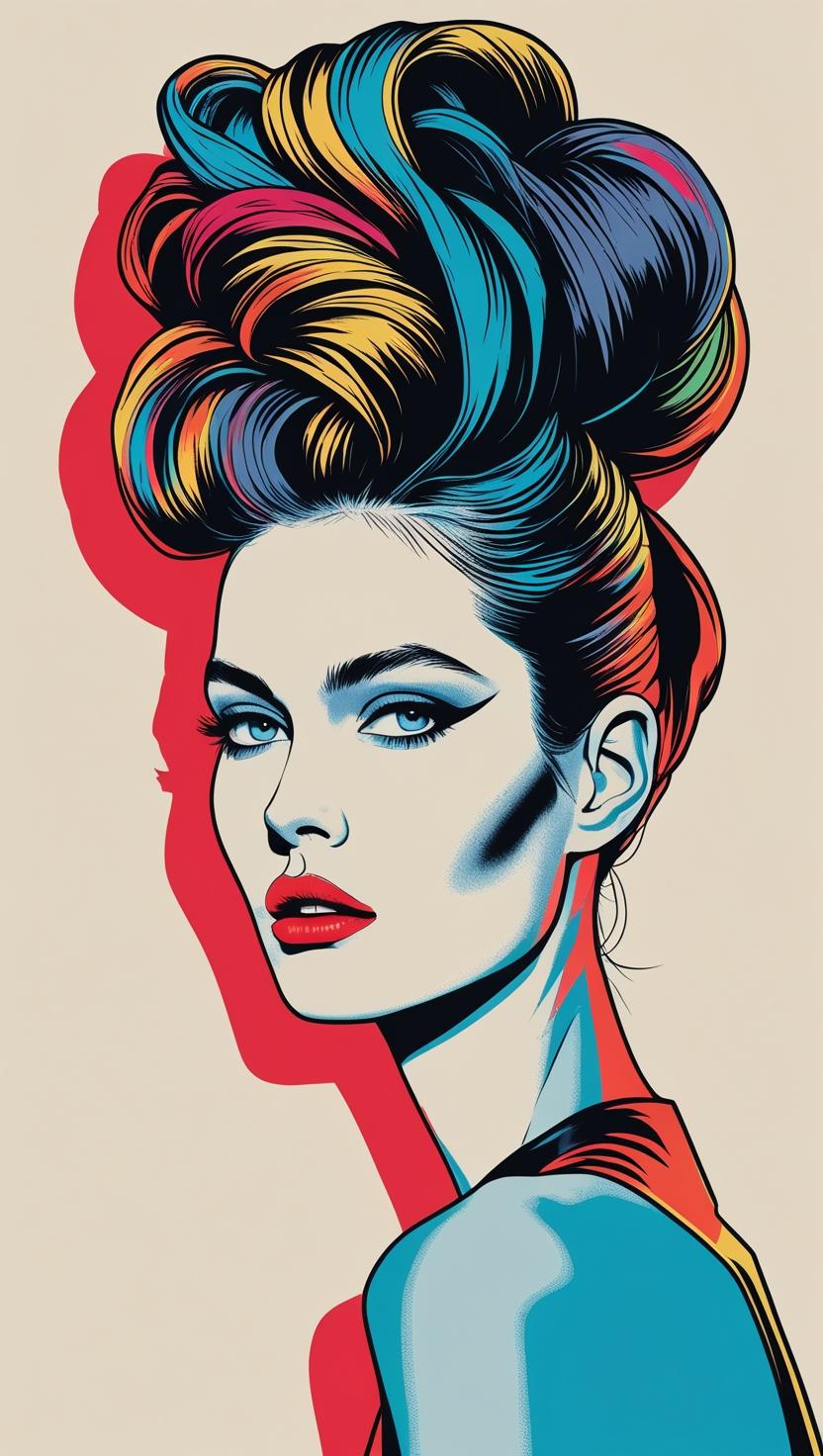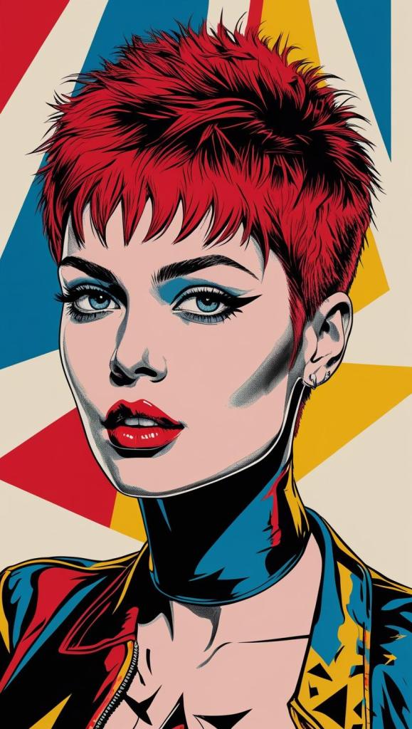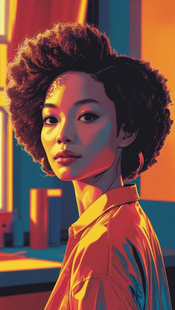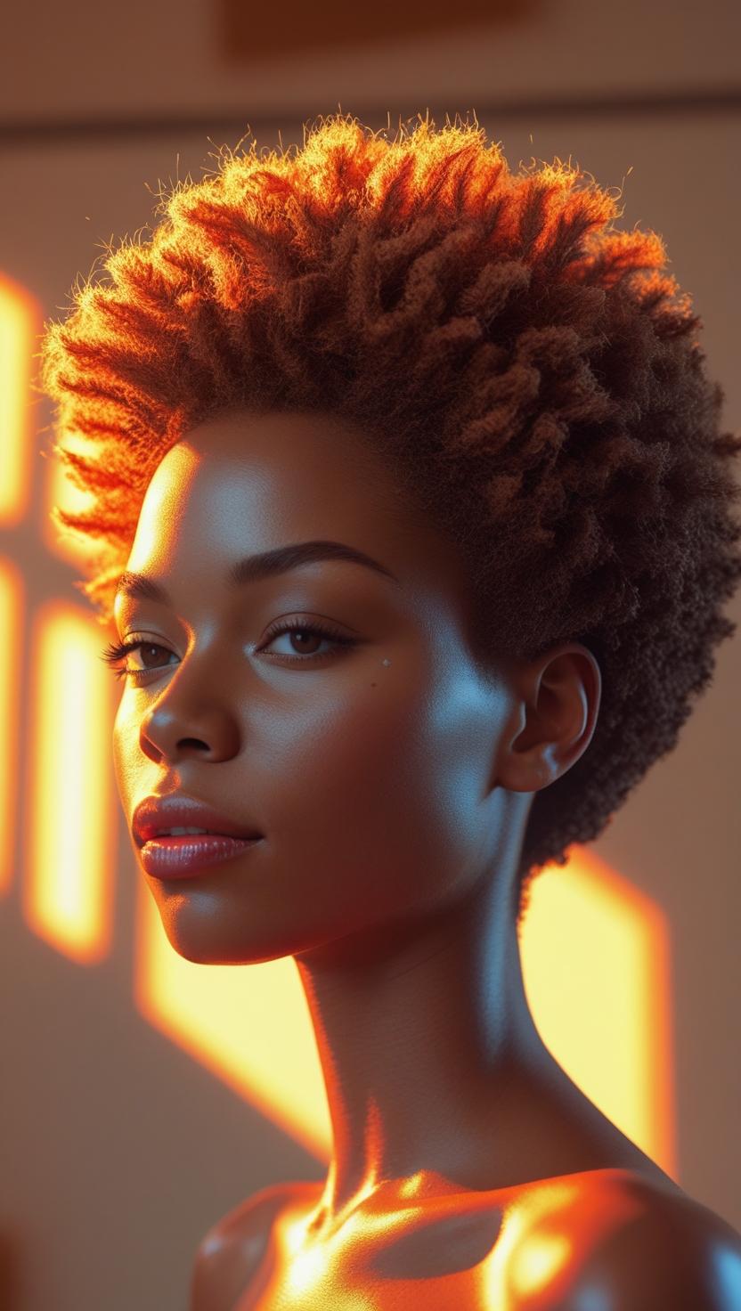 A futuristic woman with vibrant, metallic space buns and neon streaks, against a backdrop of glowing city lights.short hair