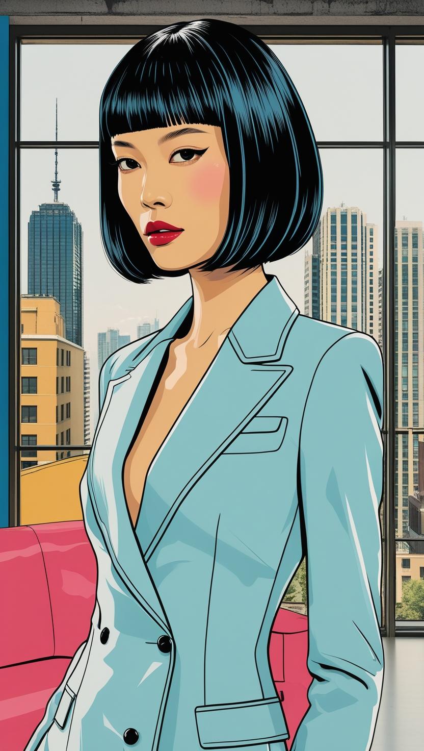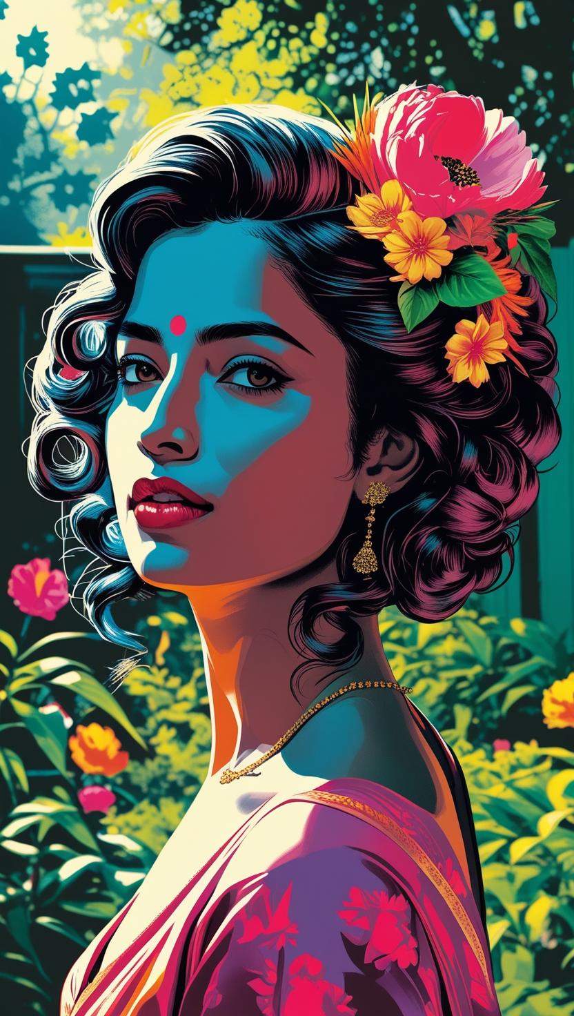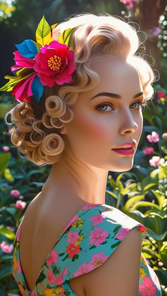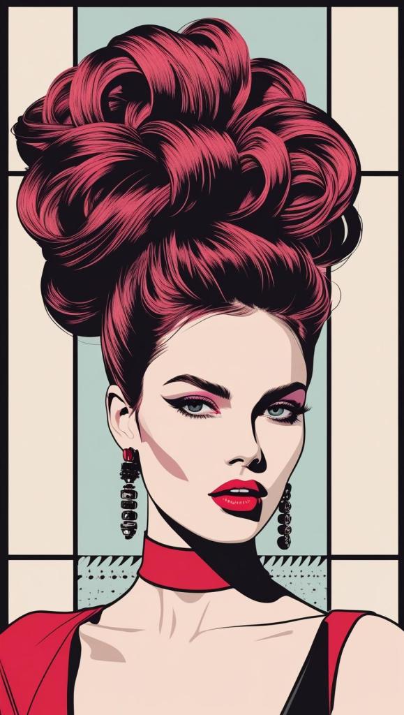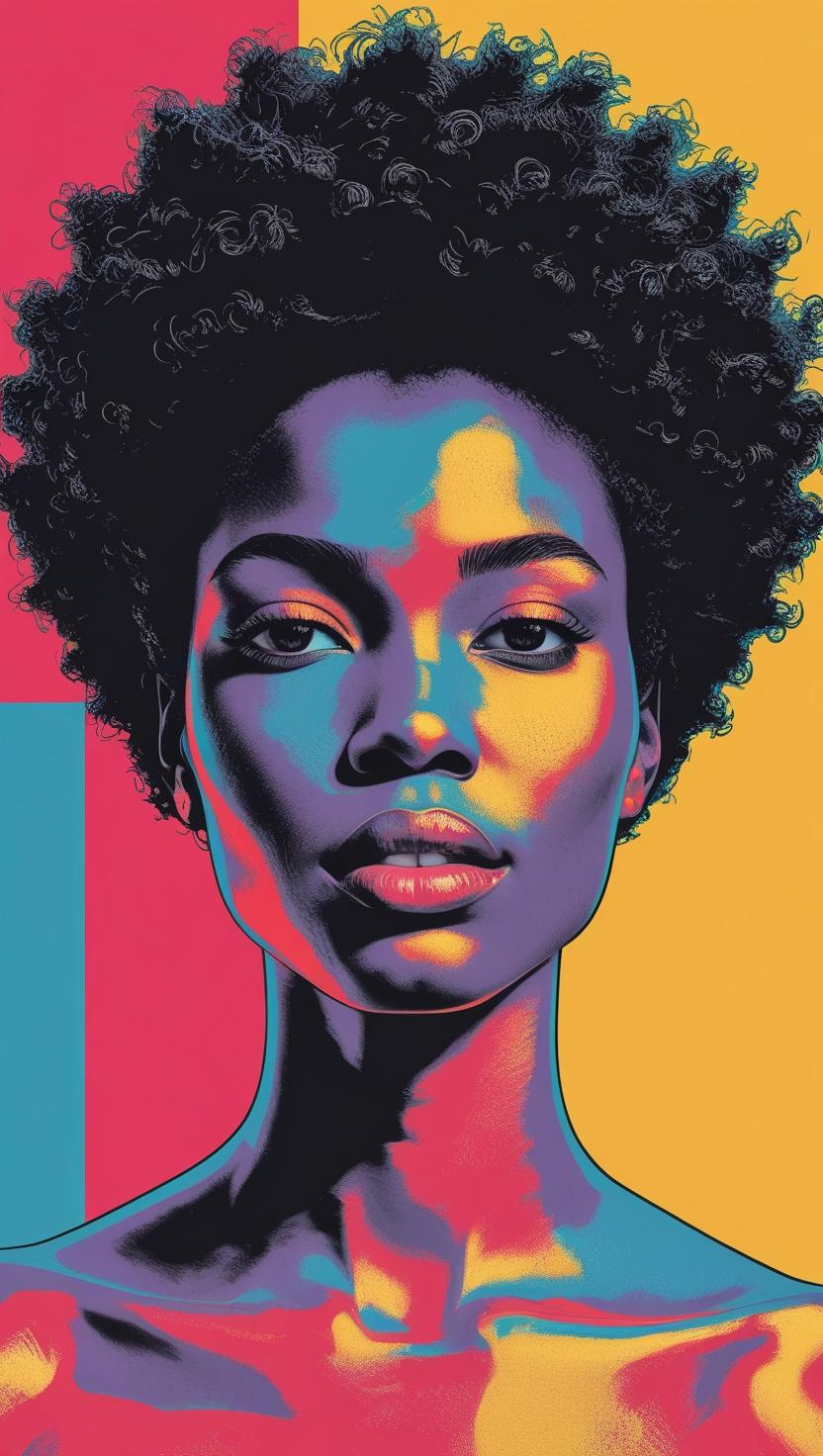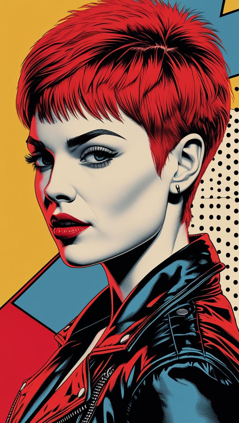 A futuristic woman with vibrant, metallic space buns and neon streaks, against a backdrop of glowing city lights.short hair