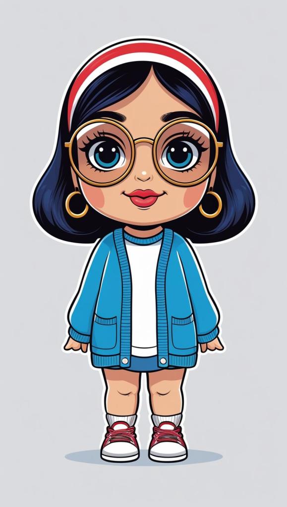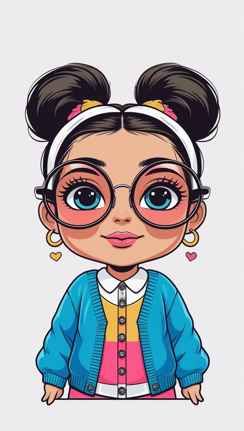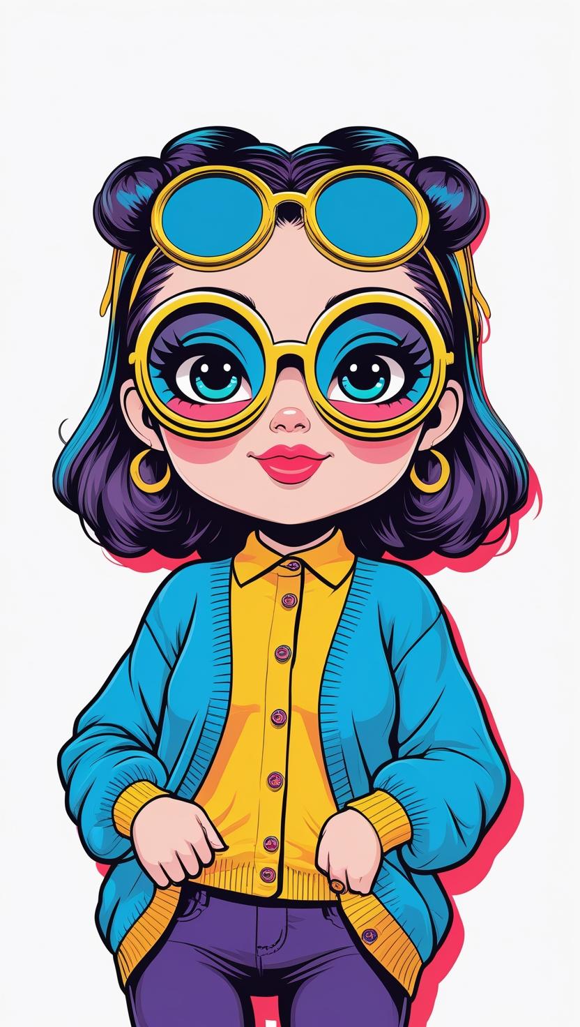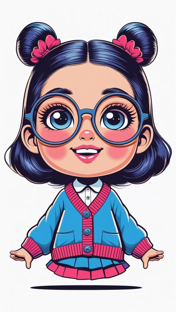 Playful girl with oversized round glasses, blue cardigan, kawaii chibi style, white background, high resolution, PNG, vector clipart, full body