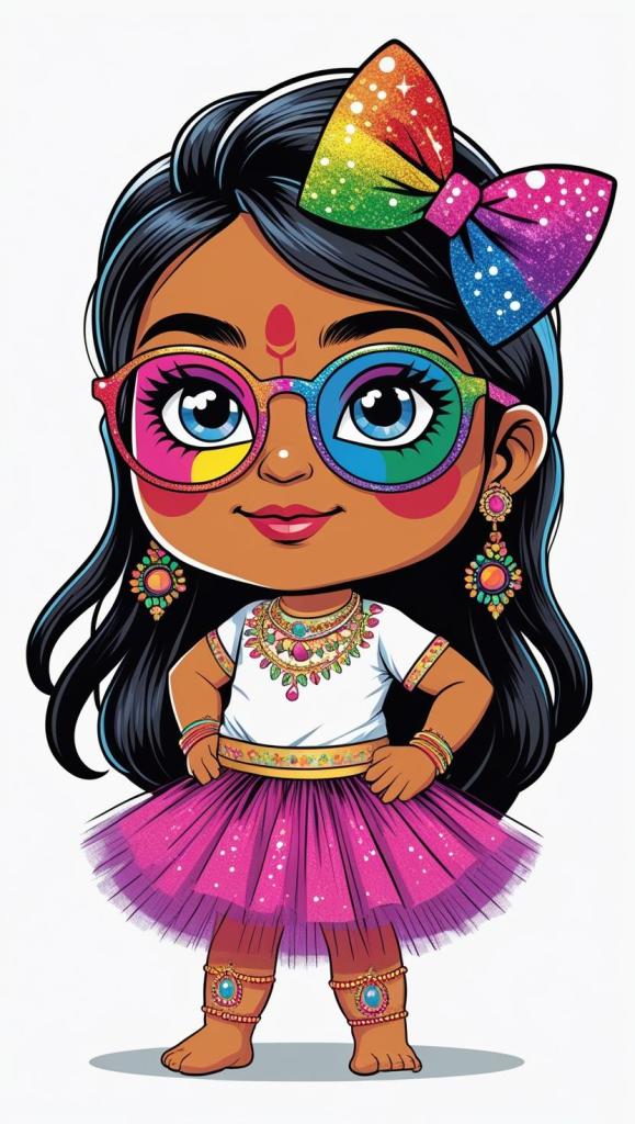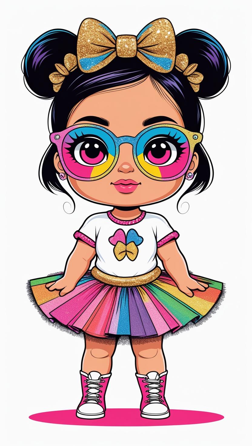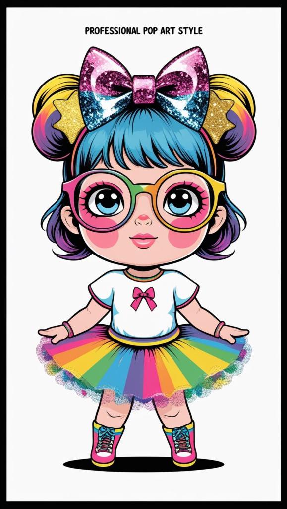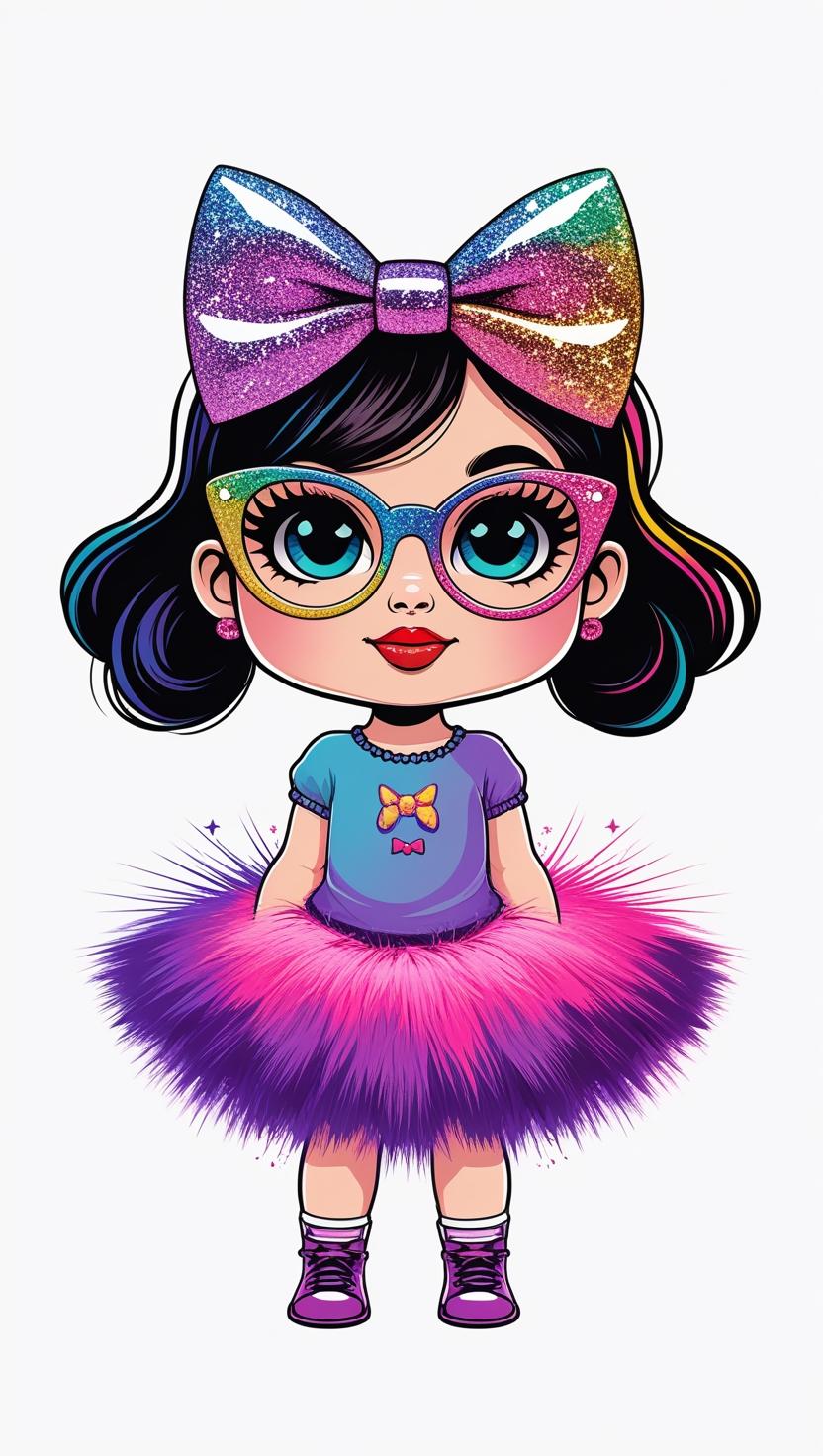 Playful girl with oversized round glasses, blue cardigan, kawaii chibi style, white background, high resolution, PNG, vector clipart, full body