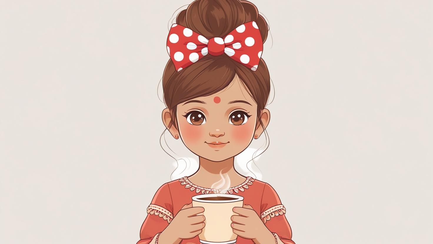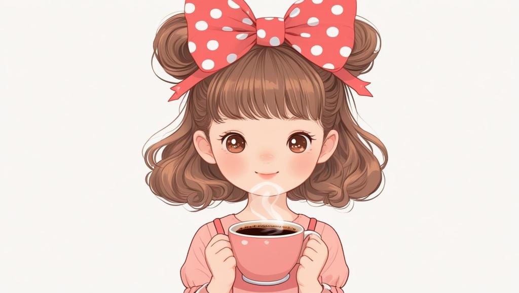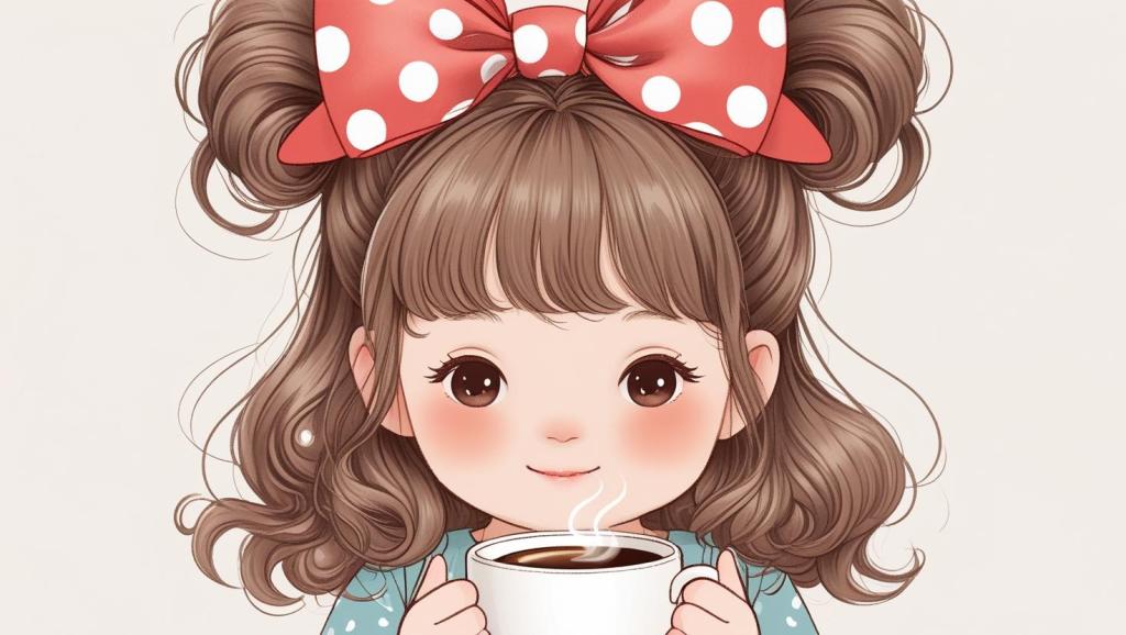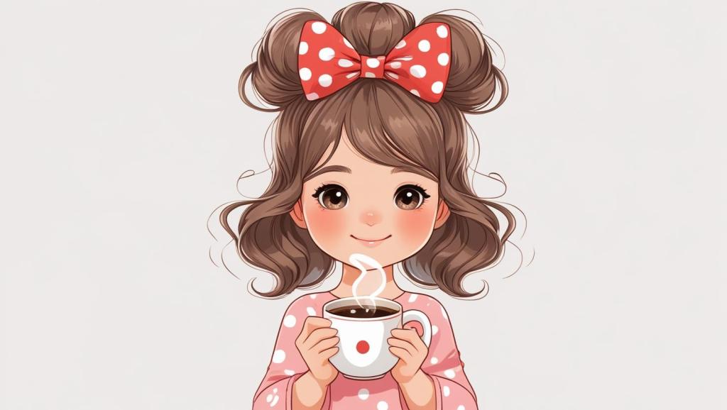 Sweet girl with soft brown hair in a top bun, tied with a big red bow with white polka dots, holding warm coffee cup, pastel kawaii style, white background