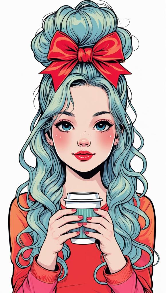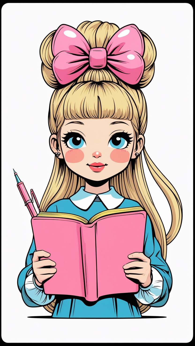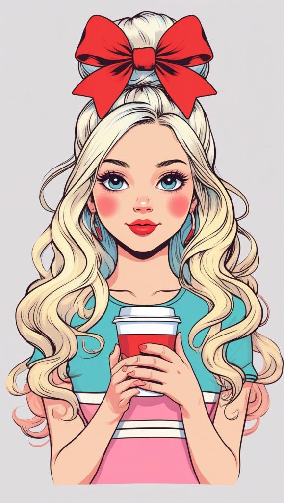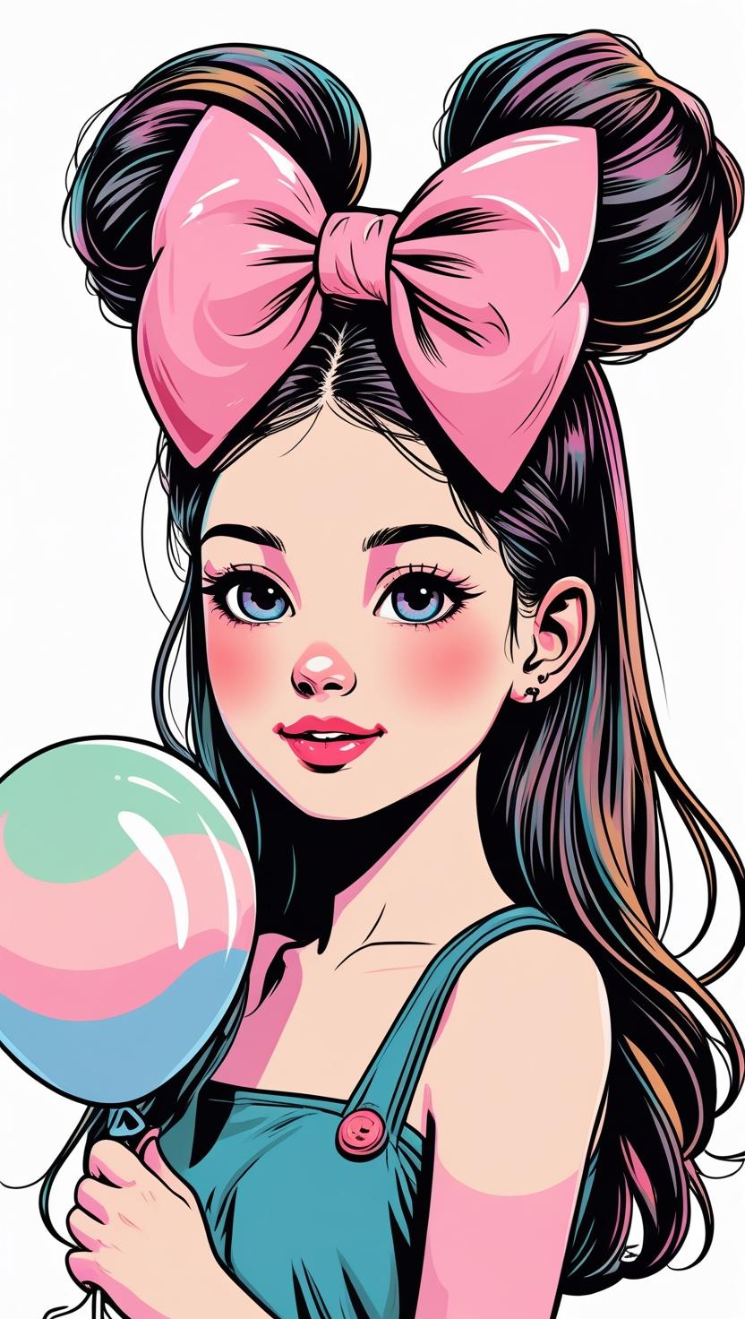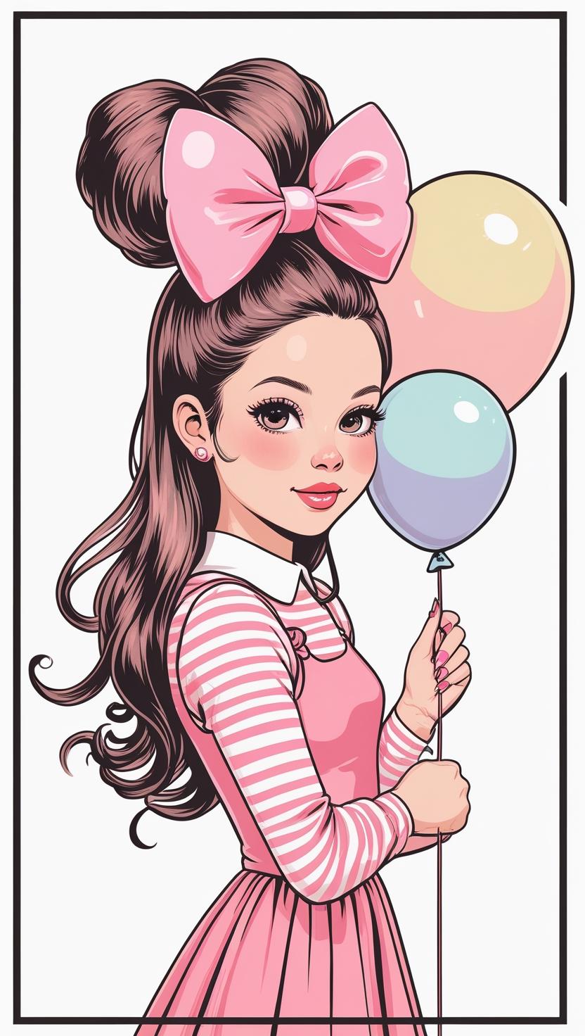 Playful girl with messy bun,wavy hair, blue polka dot ribbon, striped shirt, big eyes, white background, high resolution, PNG, vector clipart