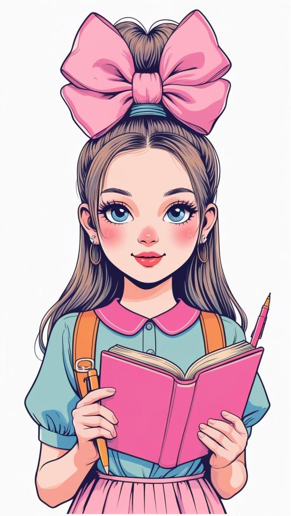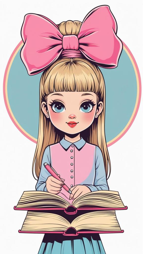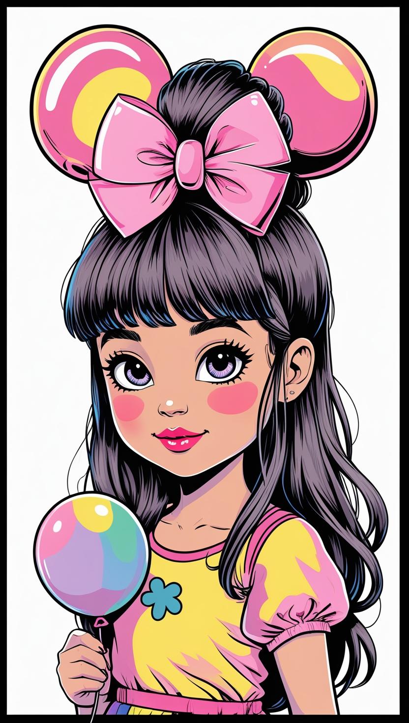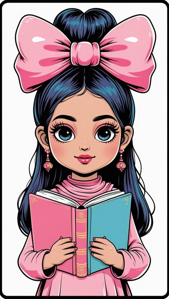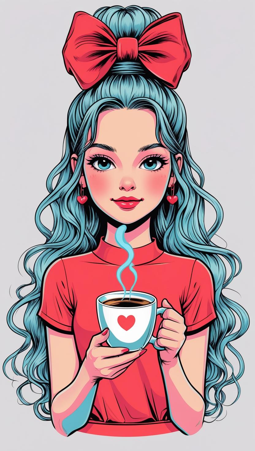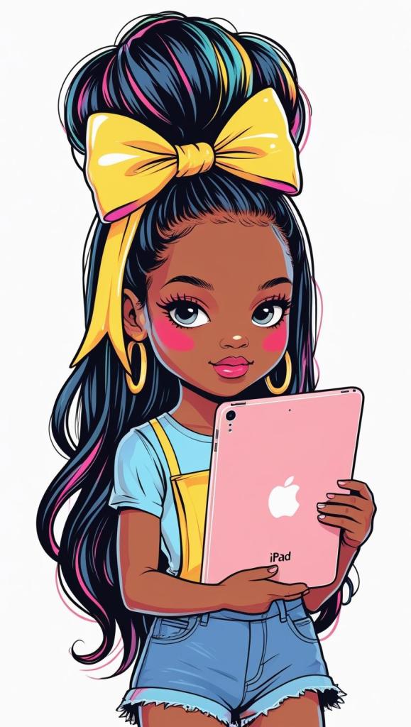 Playful girl with messy bun,wavy hair, blue polka dot ribbon, striped shirt, big eyes, white background, high resolution, PNG, vector clipart