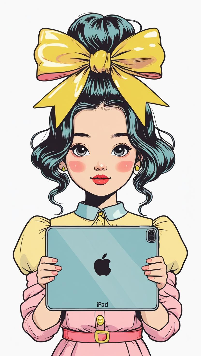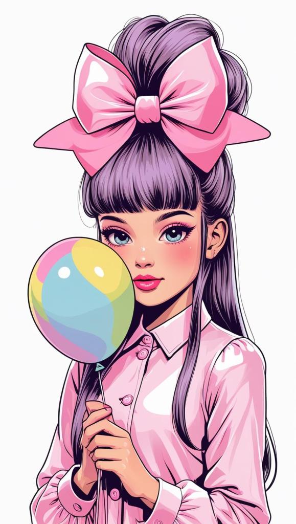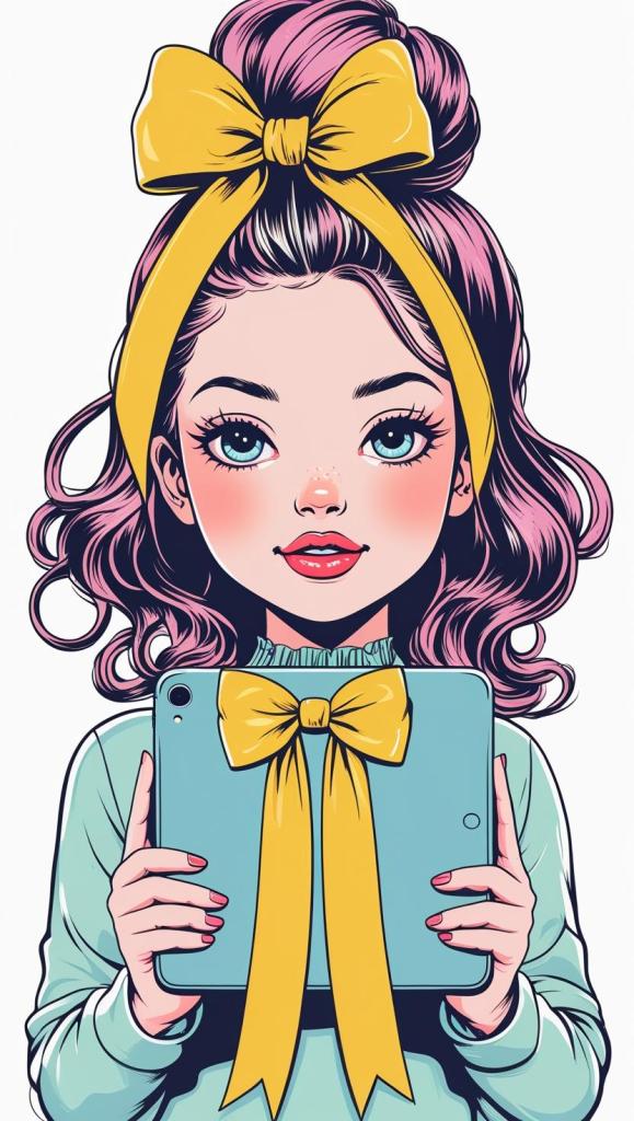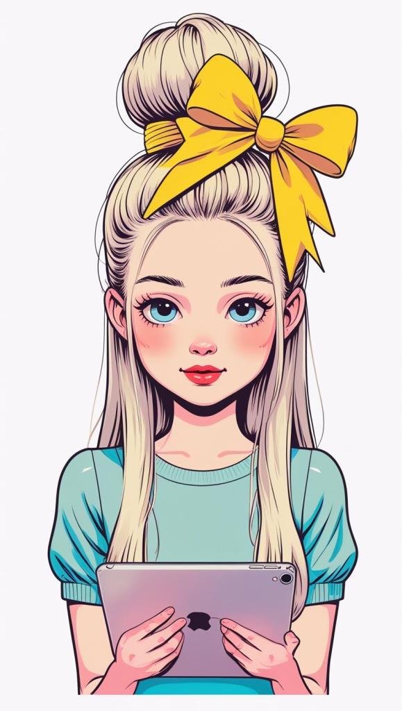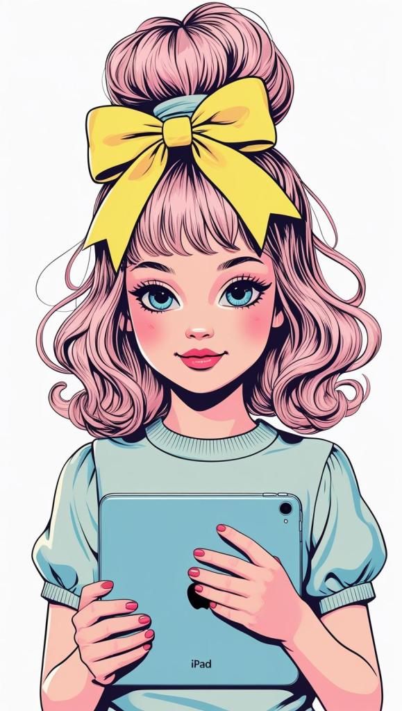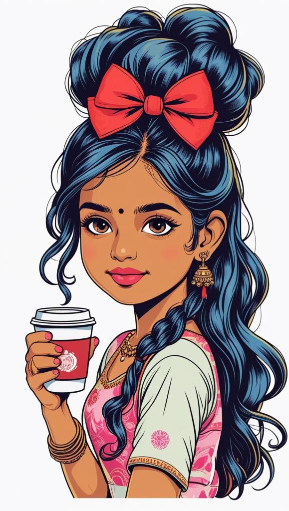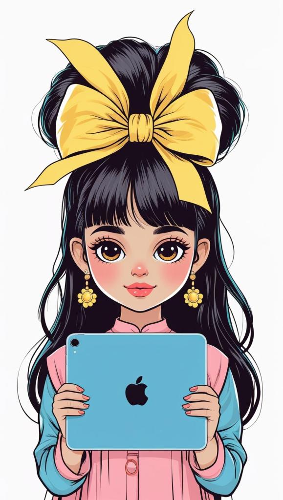 Playful girl with messy bun,wavy hair, blue polka dot ribbon, striped shirt, big eyes, white background, high resolution, PNG, vector clipart