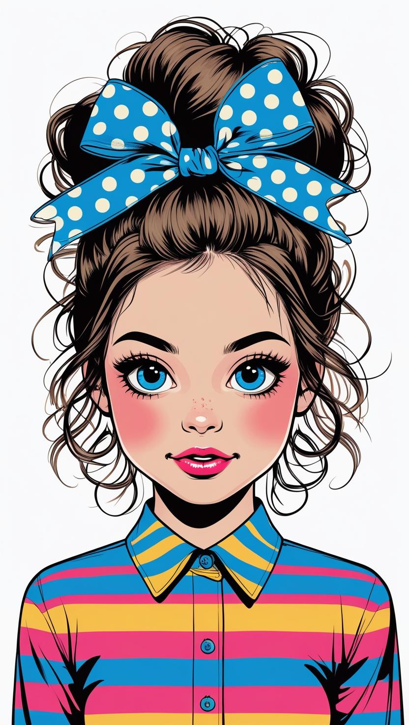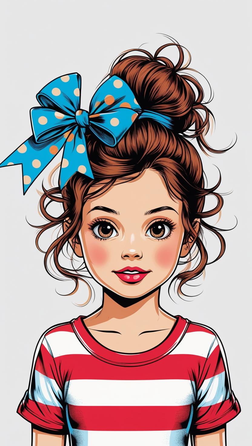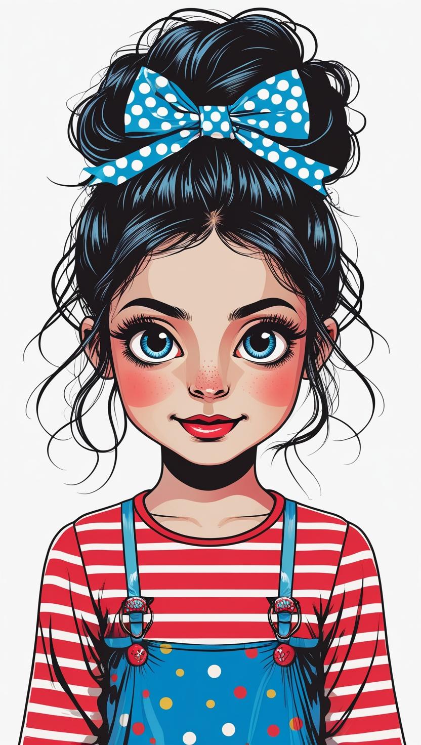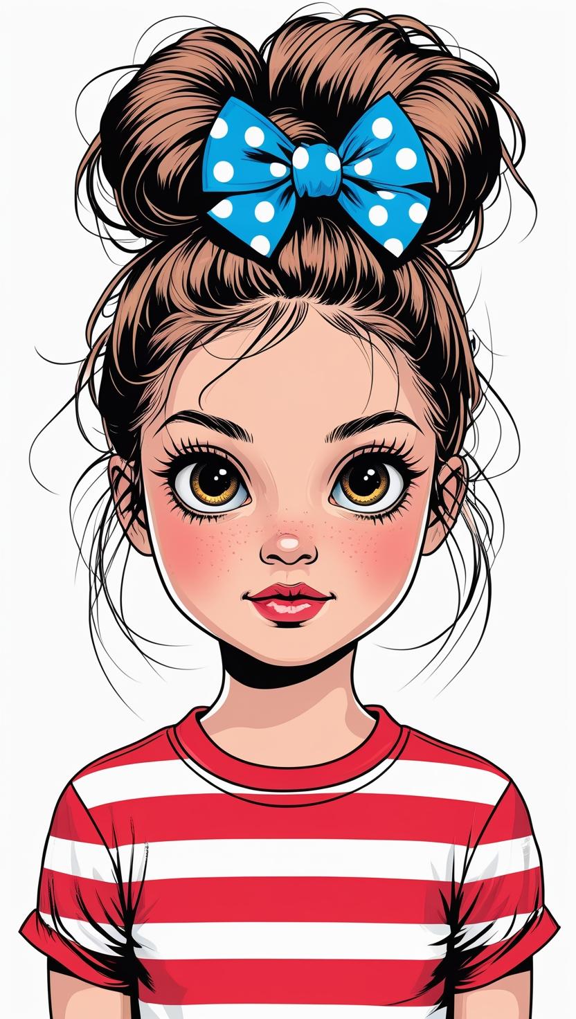 Playful girl with messy bun,wavy hair, blue polka dot ribbon, striped shirt, big eyes, white background, high resolution, PNG, vector clipart