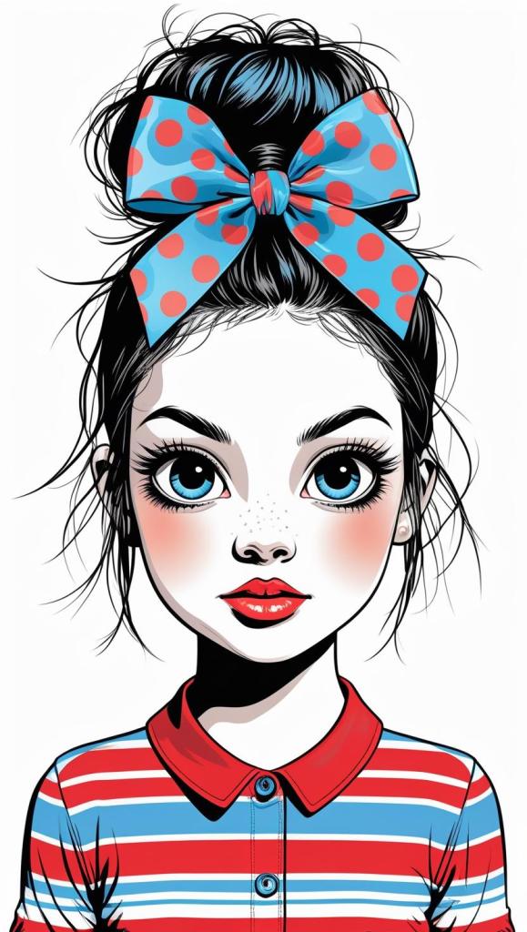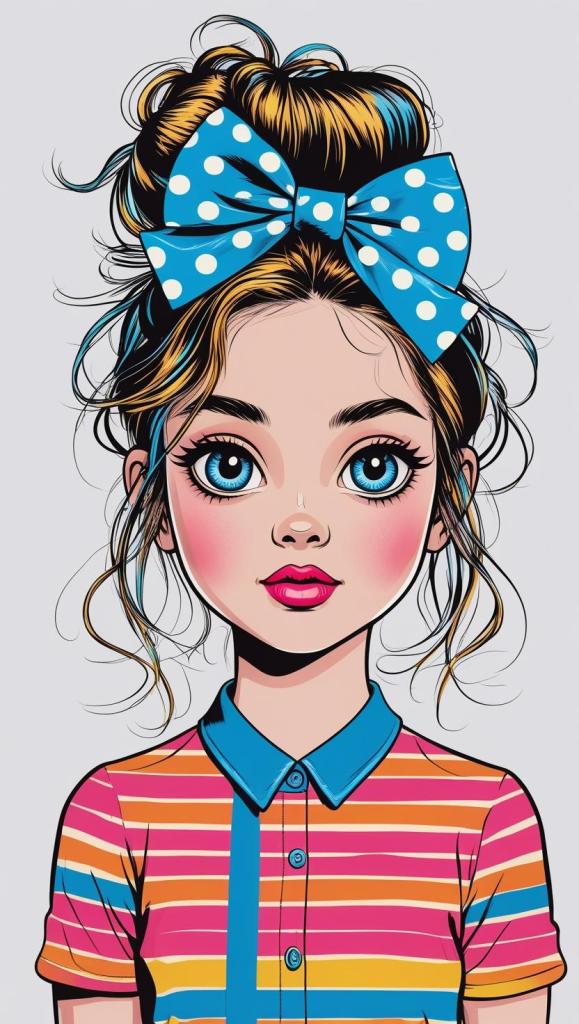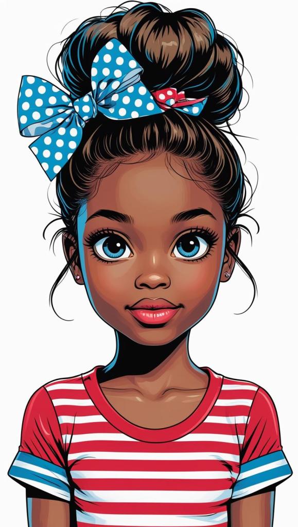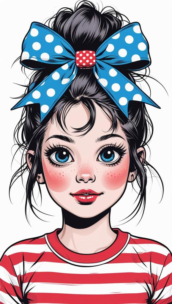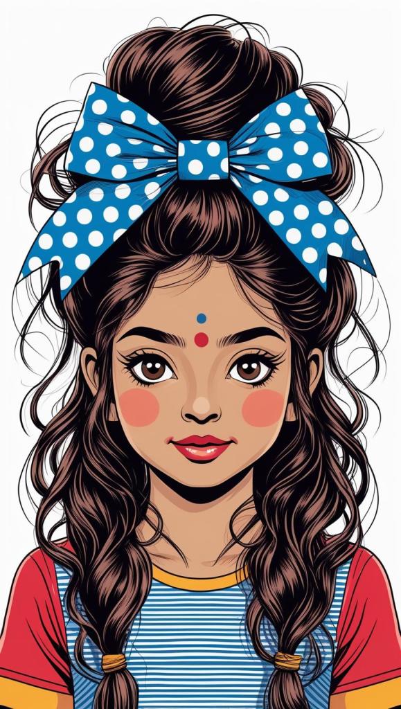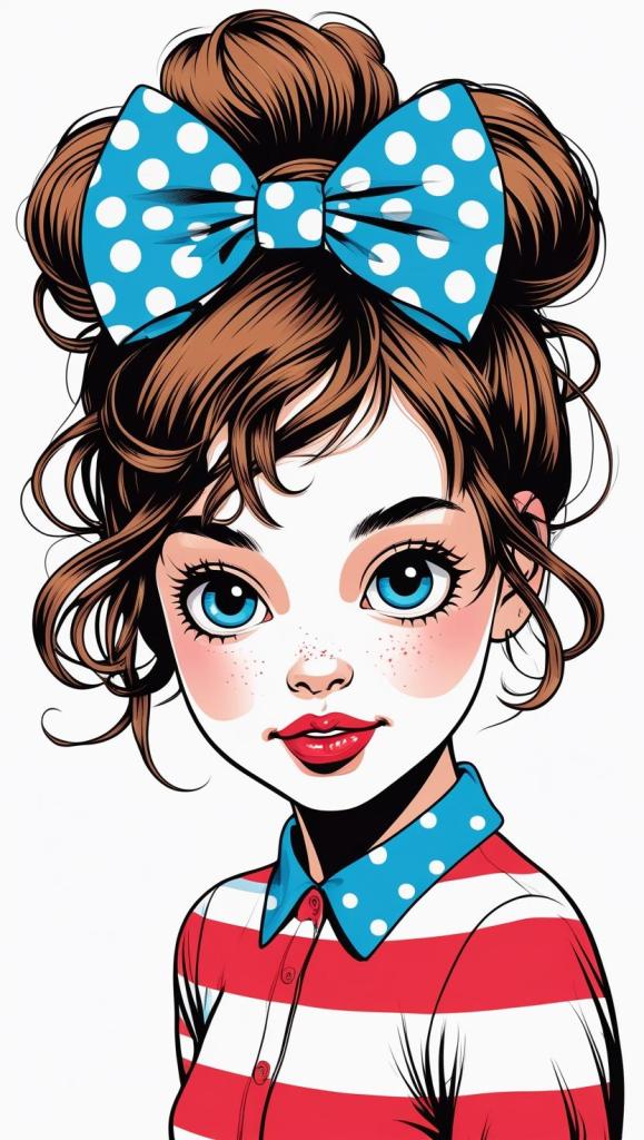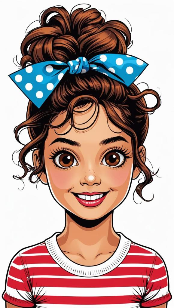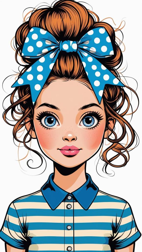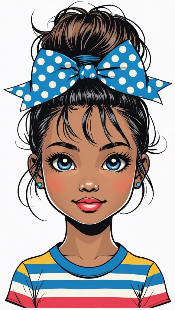 Playful girl with messy bun,wavy hair, blue polka dot ribbon, striped shirt, big eyes, white background, high resolution, PNG, vector clipart