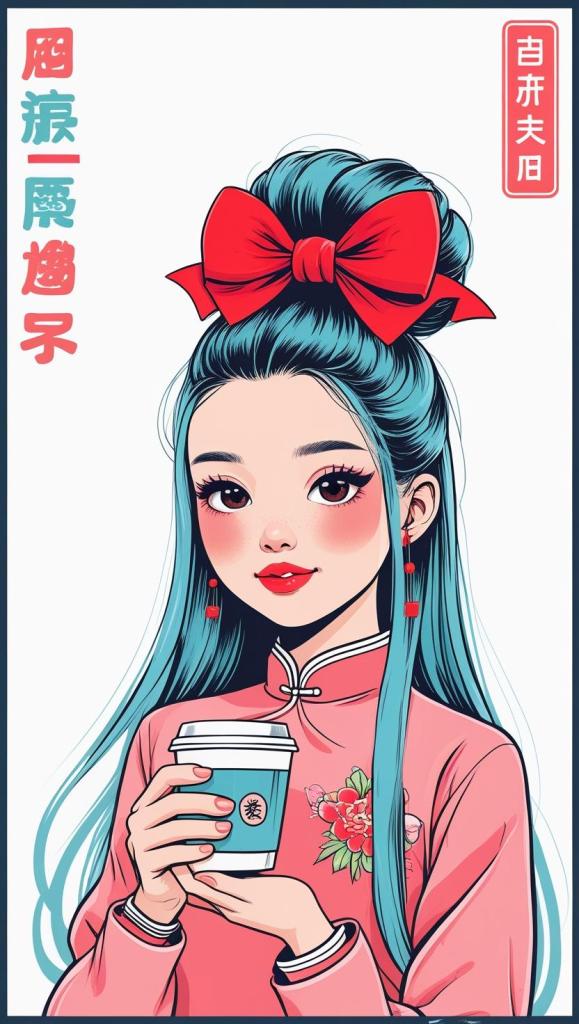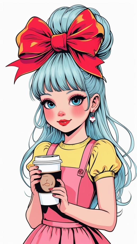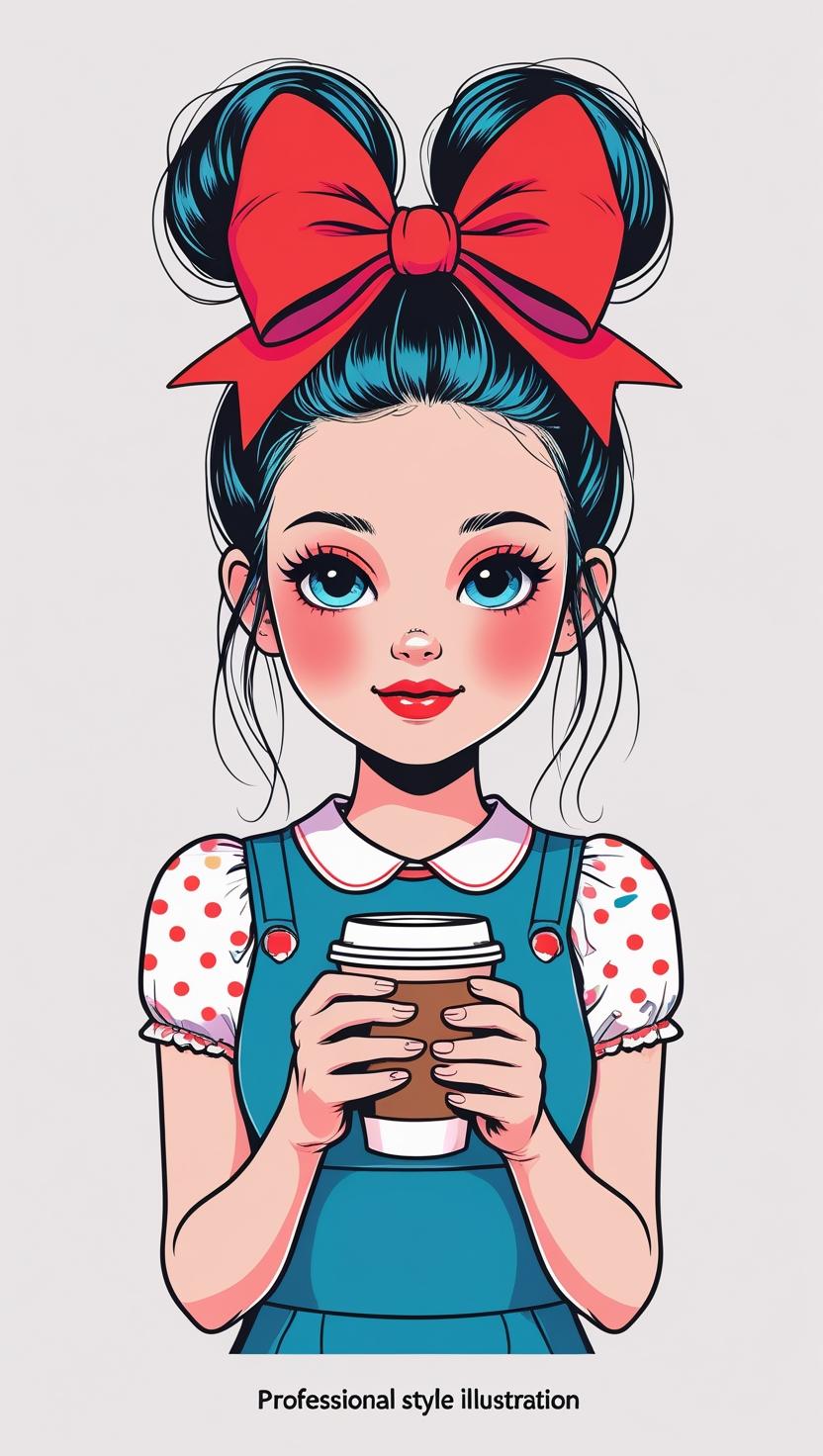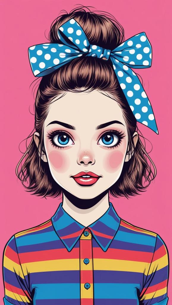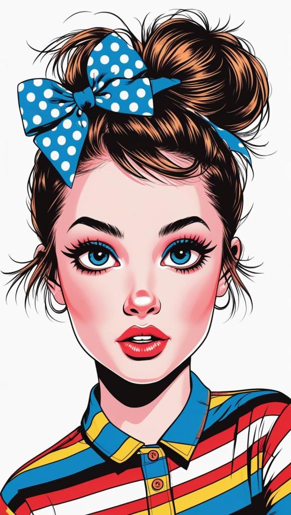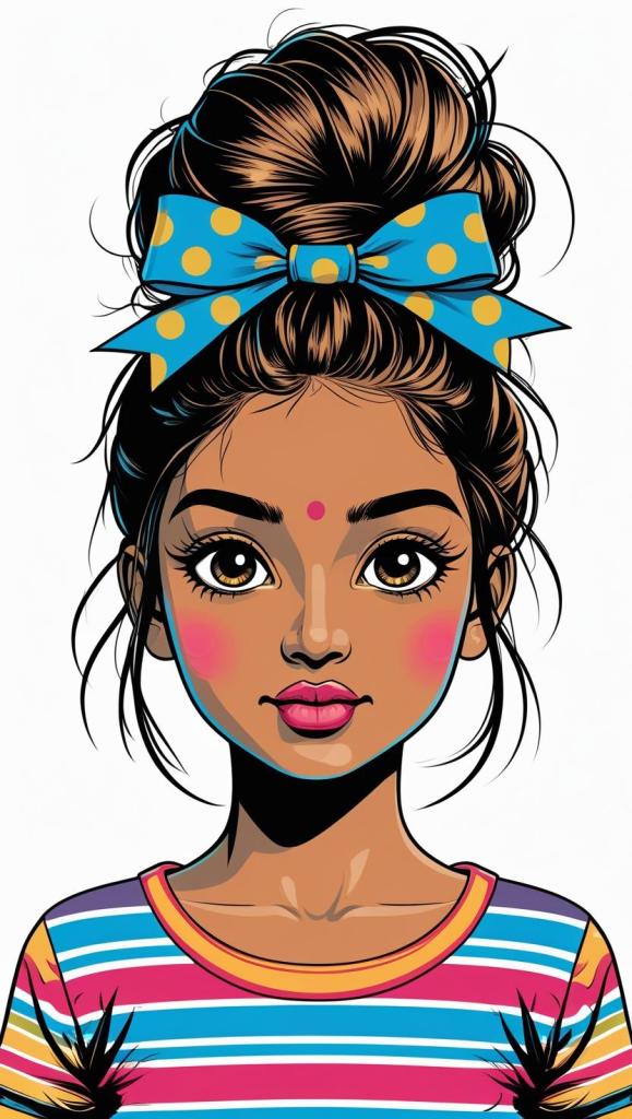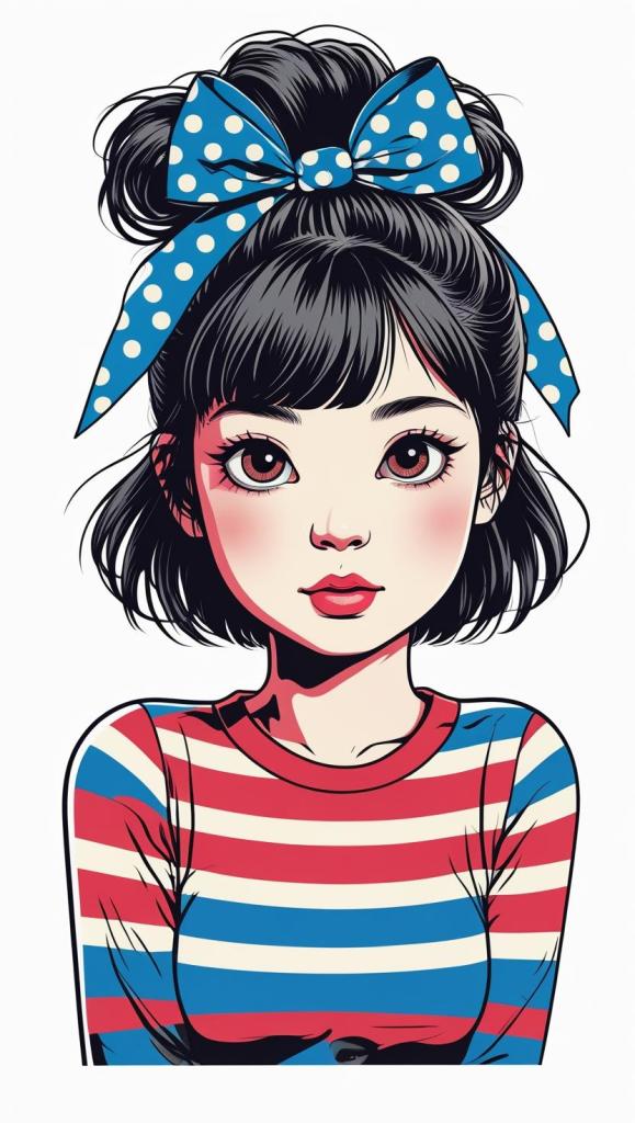 Playful girl with messy bun,wavy hair, blue polka dot ribbon, striped shirt, big eyes, white background, high resolution, PNG, vector clipart
