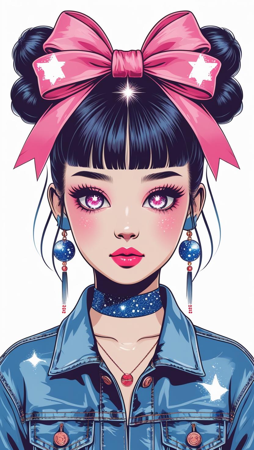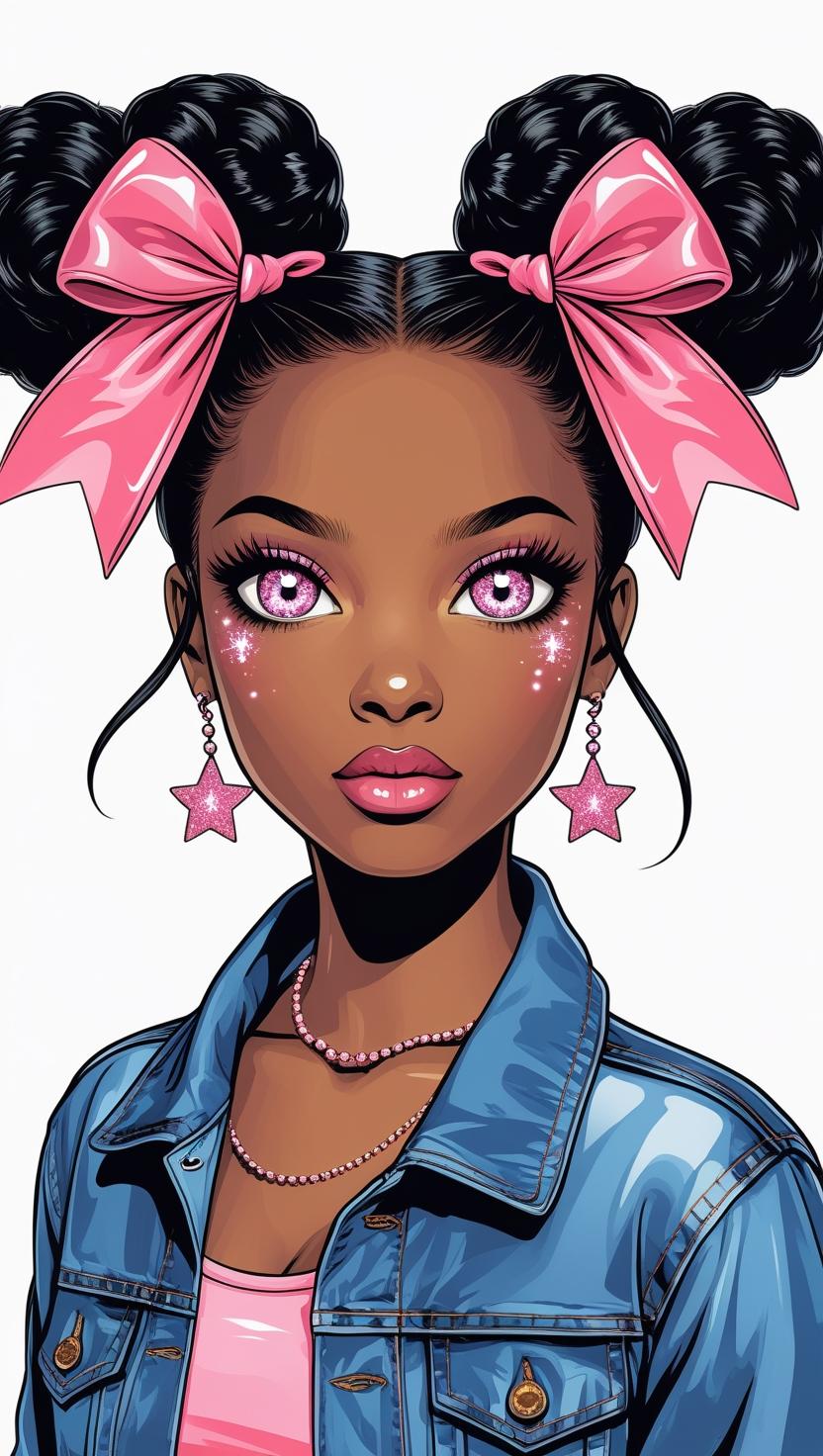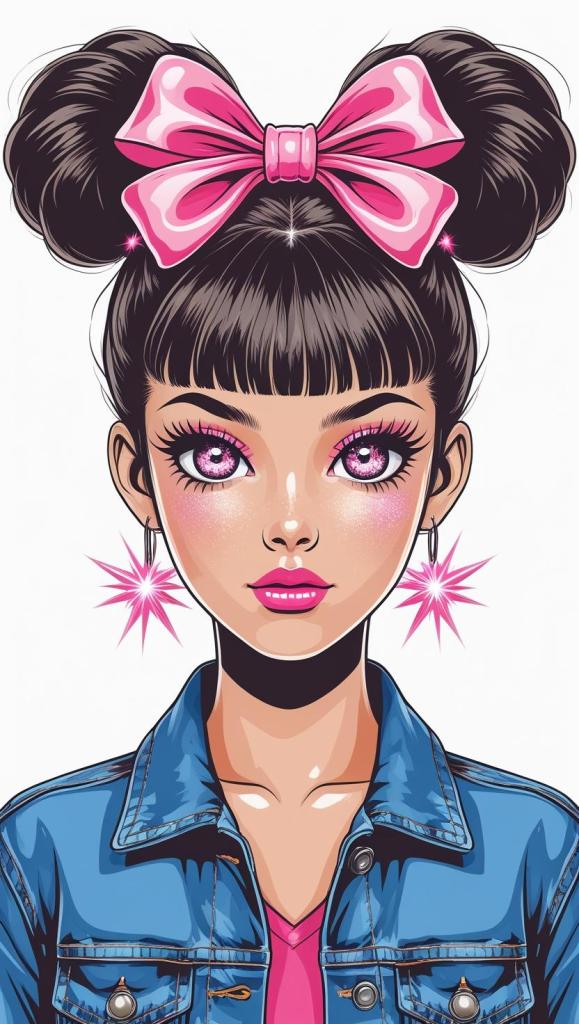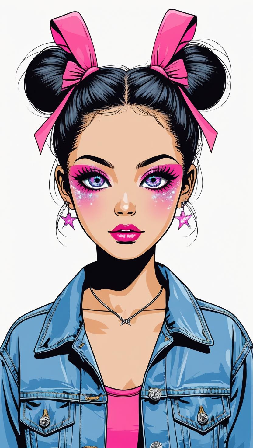 Playful girl with pink hair bun, black bow, leather jacket, sparkly eyes, white background, high resolution, PNG, vector clipart