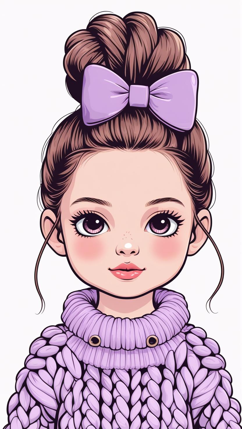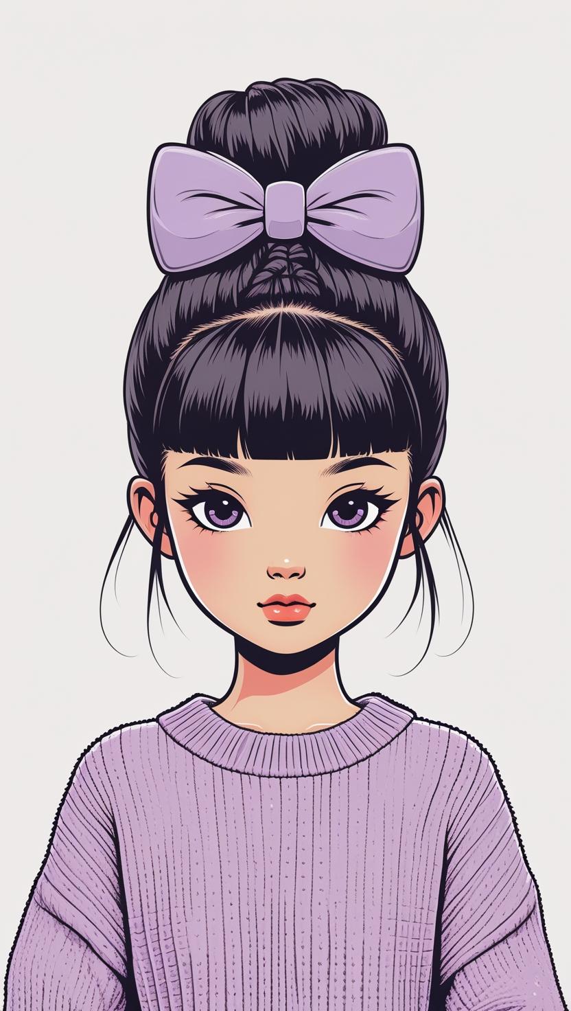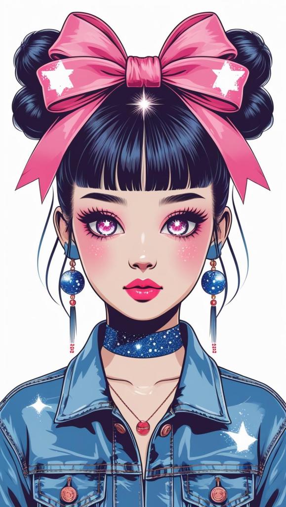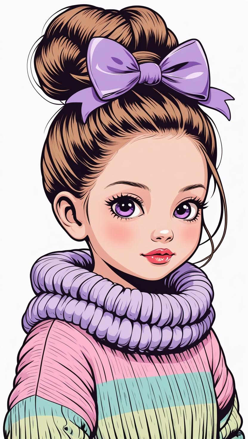 Playful girl with pink hair bun, black bow, leather jacket, sparkly eyes, white background, high resolution, PNG, vector clipart