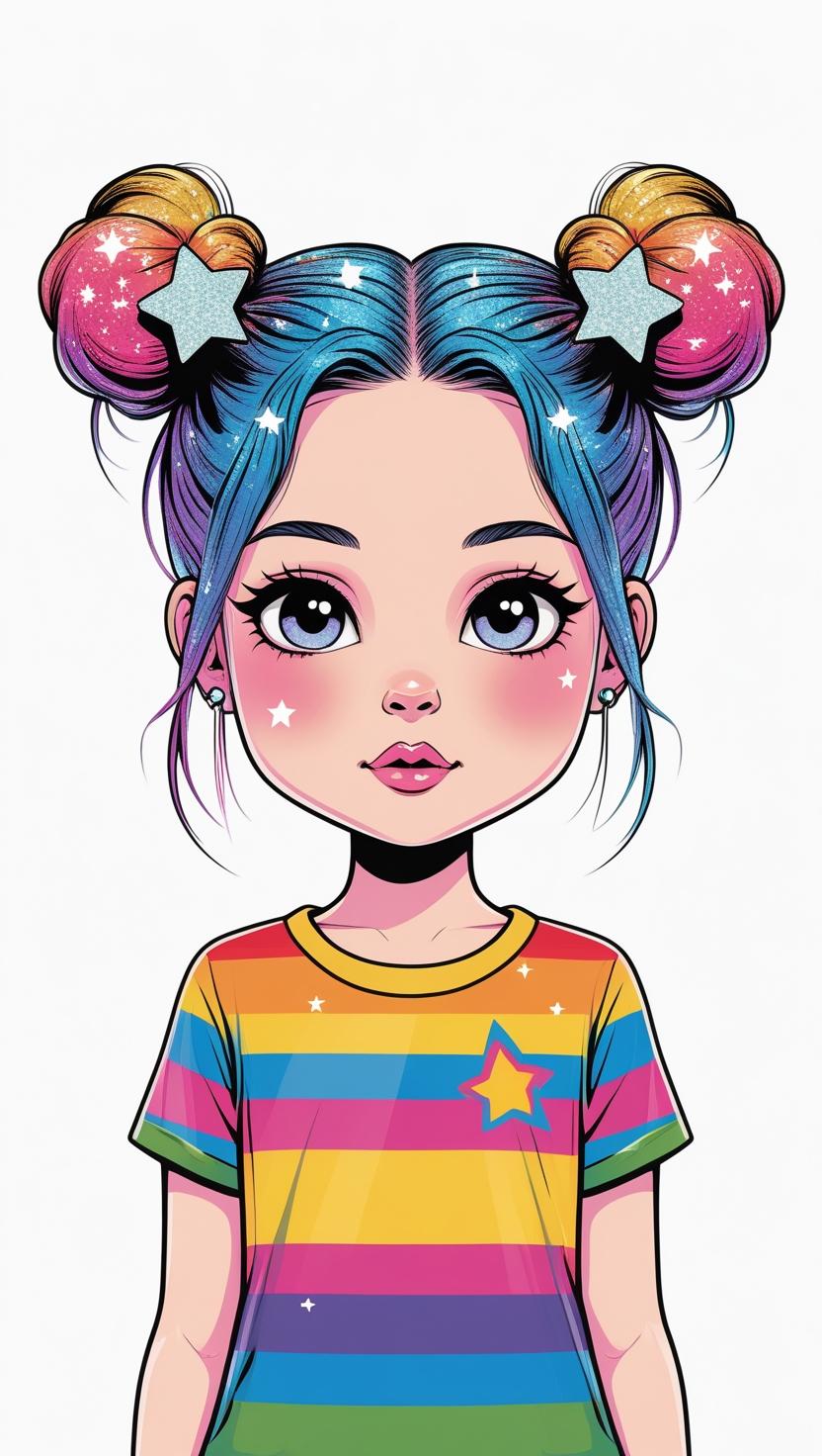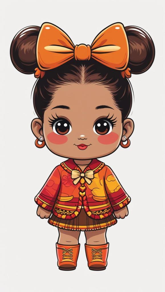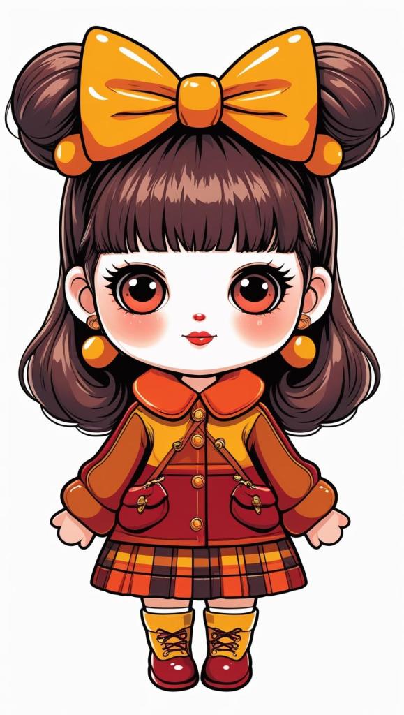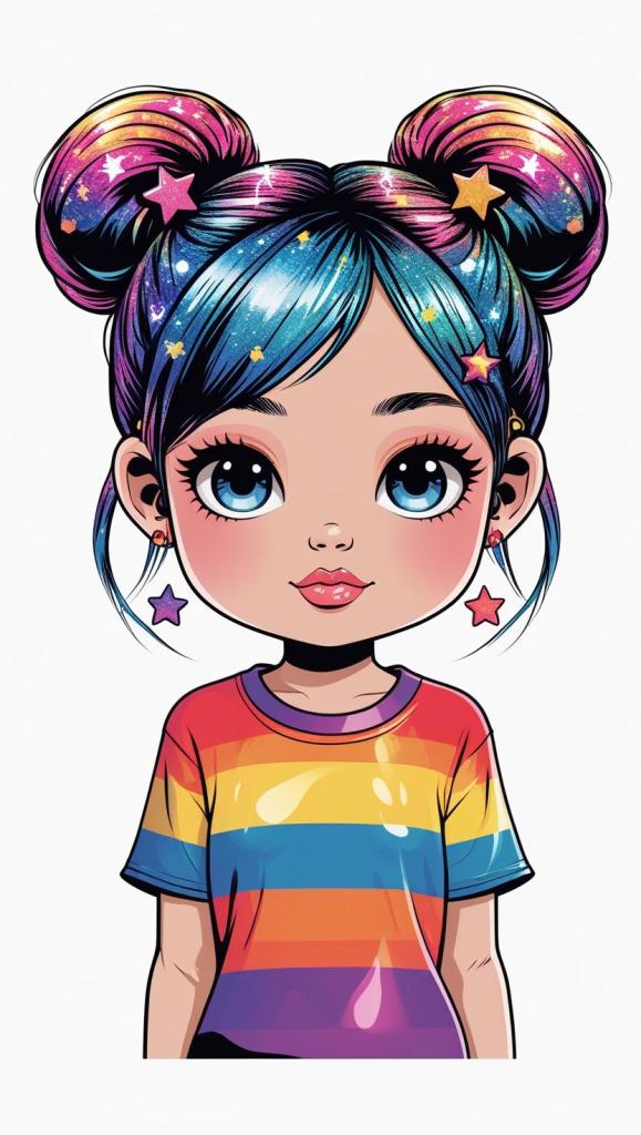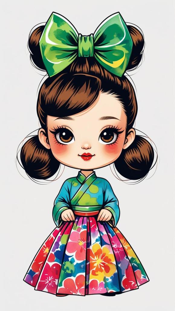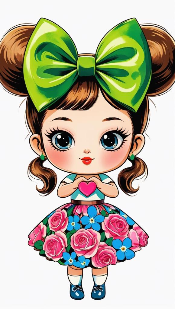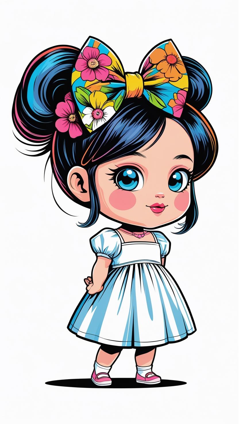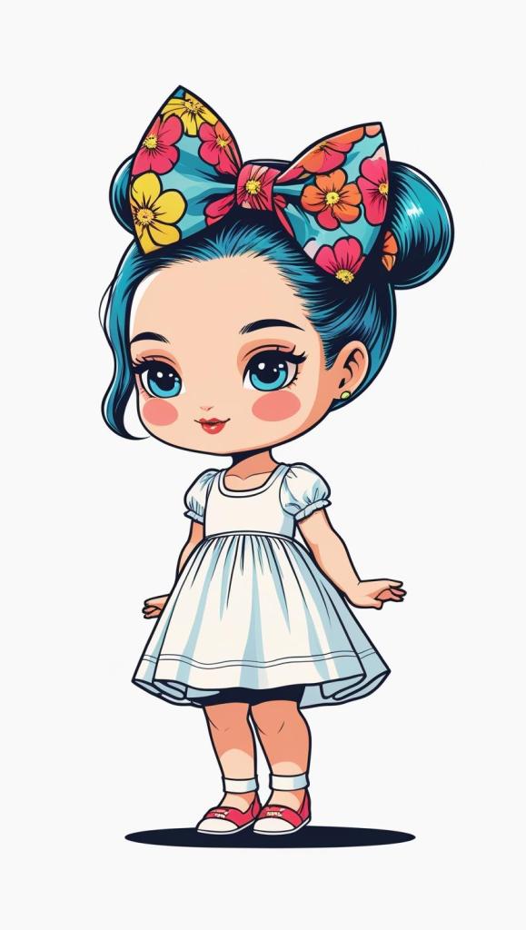 Adorable girl with braided bun, lavender bow, cozy sweater, pastel kawaii, white background, high resolution, PNG, vector clipart