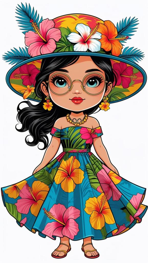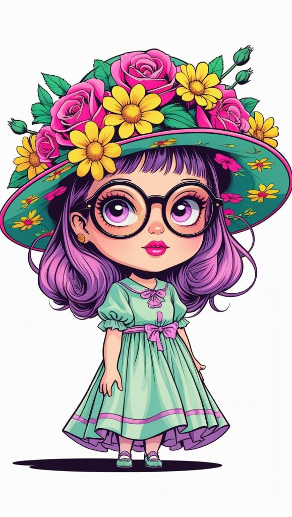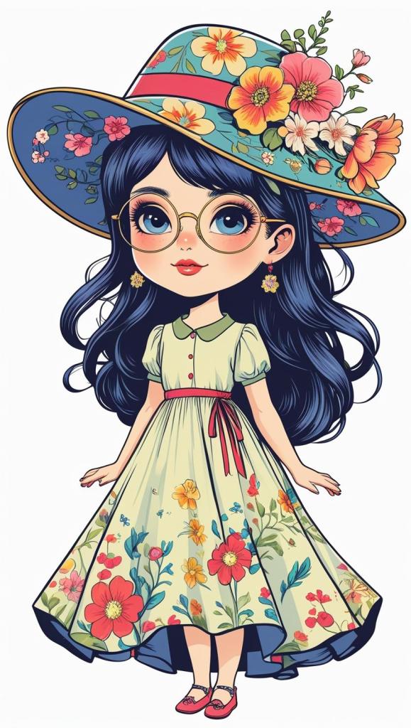Whimsical girl with floral hat, vintage glasses, spring dress, chibi clipart, white background, high resolution, PNG, vector clipart, full body