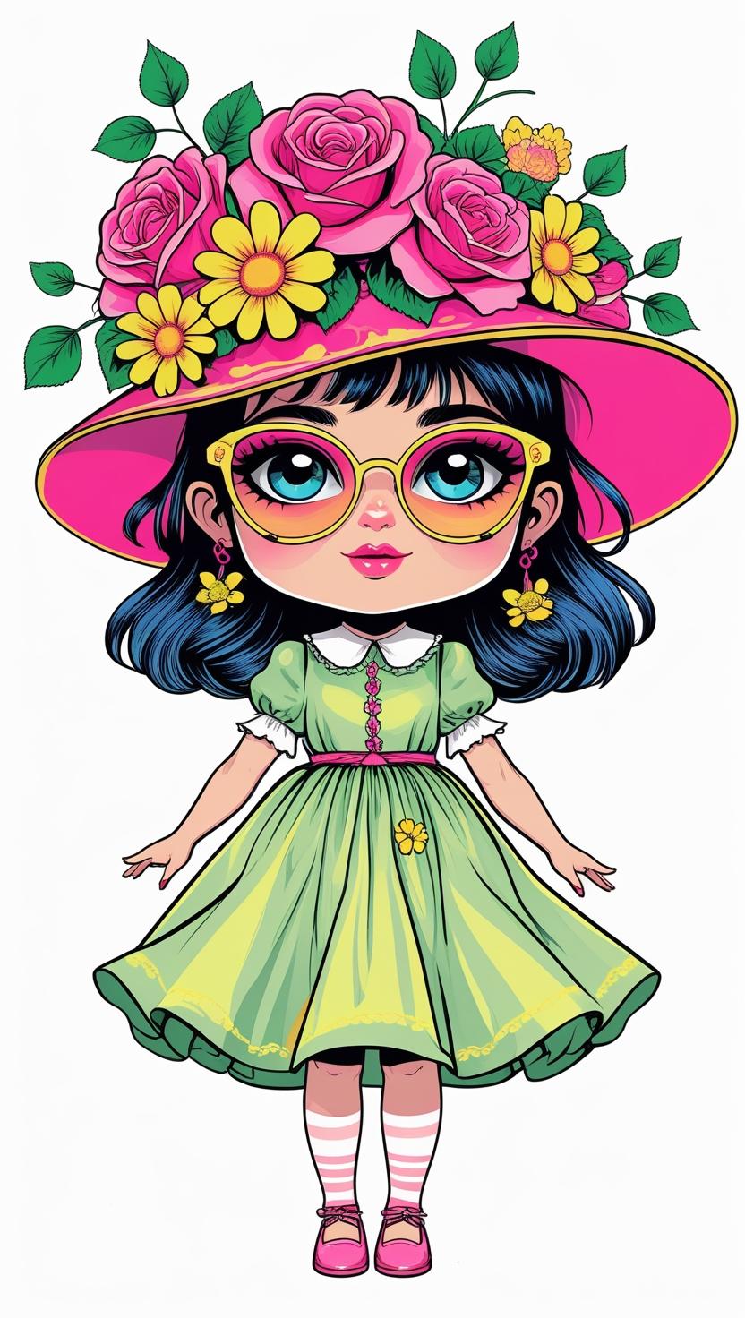 Whimsical girl with floral hat, vintage glasses, spring dress, chibi clipart, white background, high resolution, PNG, vector clipart, full body